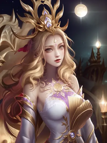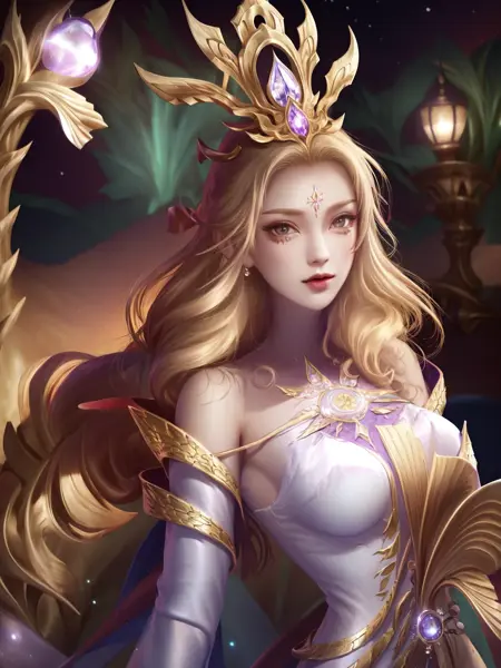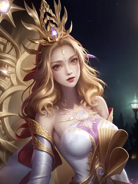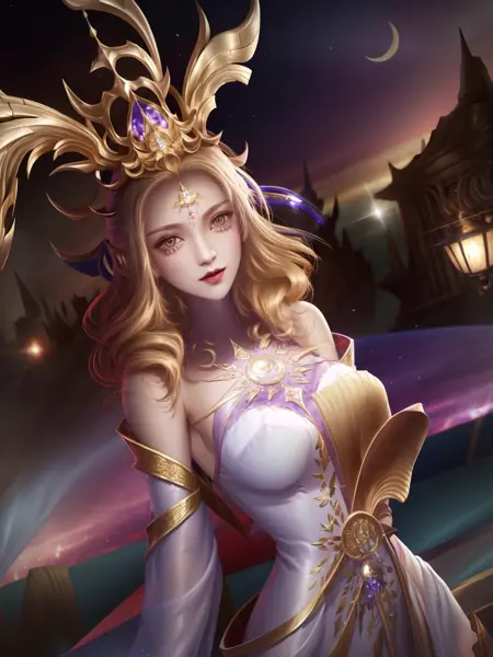 - WZRYwuzetianNKSSY, 1girl, solo,white dress, breasts, jewelry, long hair, blonde hair, makeup, gold,yellow eyes, headgear,long sleeves,wide sleeves,drill hair, cityscape, night, looking at viewer, mature female, pool, hand on hip, cowboy shot,