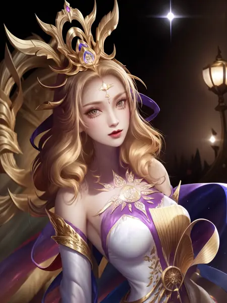 - WZRYwuzetianNKSSY, 1girl, solo, white dress, breasts, jewelry, long hair, blonde hair, makeup, gold, yellow eyes, headgear, long sleeves, wide sleeves, drill hair, cityscape, night, looking at viewer, mature female, pool, hand on hip, cowboy shot,