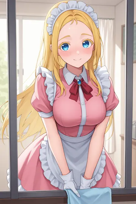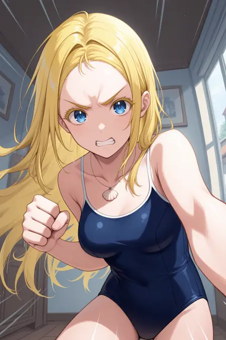 Appearance : usk0, medium breasts, blue eyes, blonde hair, forehead, colored eyelashes, long hair