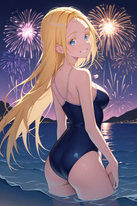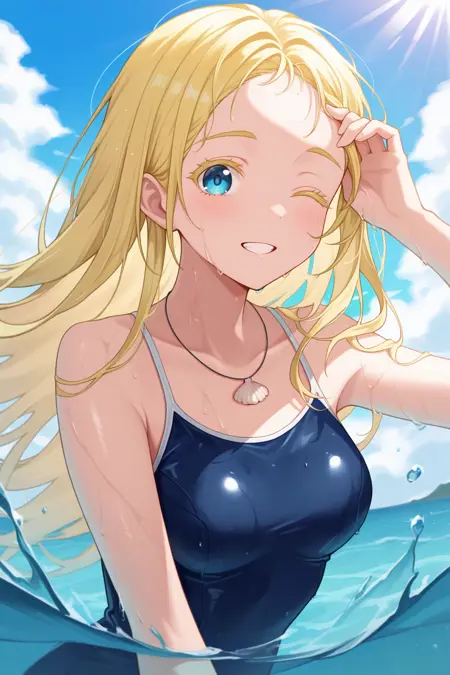 Outfit : shell necklace, blue one-piece swimsuit