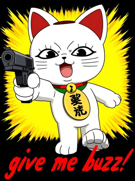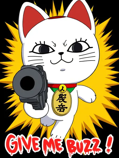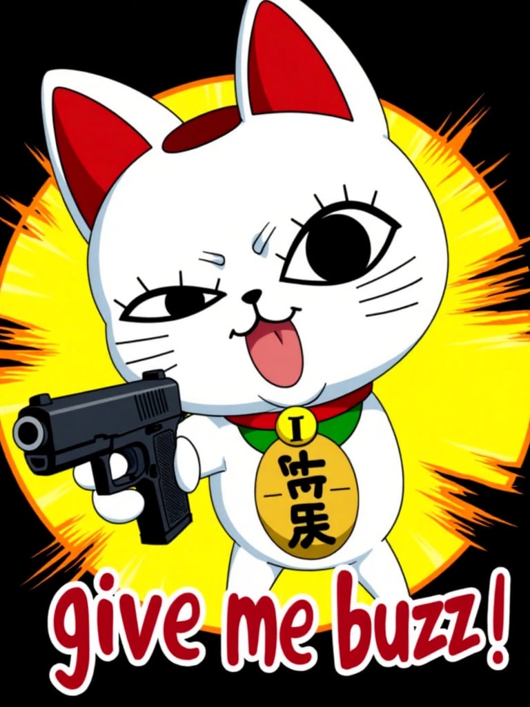an illustration of Turbo Granny, a maneki-neko mascot from anime dandadan. An animated image of a white cat with a gold tag around its neck. The tag has black characters on it. The cat's eyes are large and black. The ears of the cat are red. The background of the image is black.She has a very happy look. She is pointing a gun at the viewer with an angry look on her face. Strong perspective effect, the camera has its focal point on the gun. Text at the bottom reads "give me buzz!" in bloody red font. The background is a vibrant yellow with lots of action lines