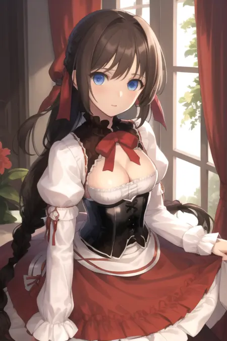 NerisFiliam, 1girl, solo, very long hair, blue eyes, red skirt, brown hair, long sleeves, dress, bow, ribbon, cleavage, medium breasts, hair ribbon, single braid, puffy sleeves, corset