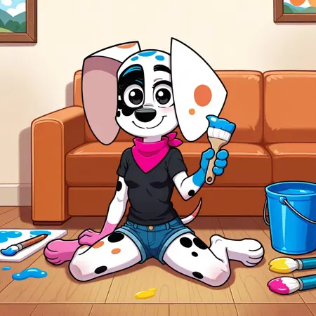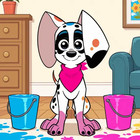 dog, dalmatian, white and black fur, black spots, colored spots, colored paws, colored tail, thin tail, large ears, black eyes, black nose, red bandana,