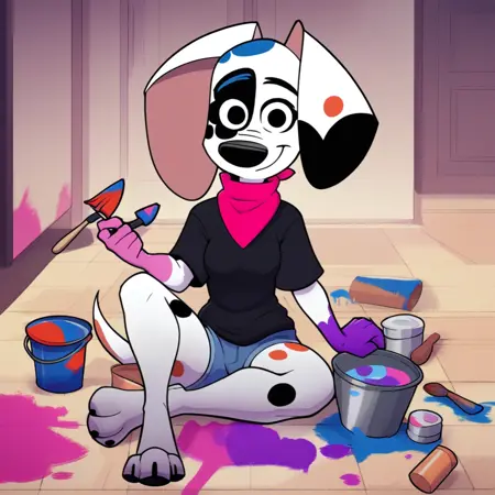 Dog, dalmatian, white and black fur, black spots, colored spots, colored paws, colored tail, thin tail, large ears, black eyes, red bandana,