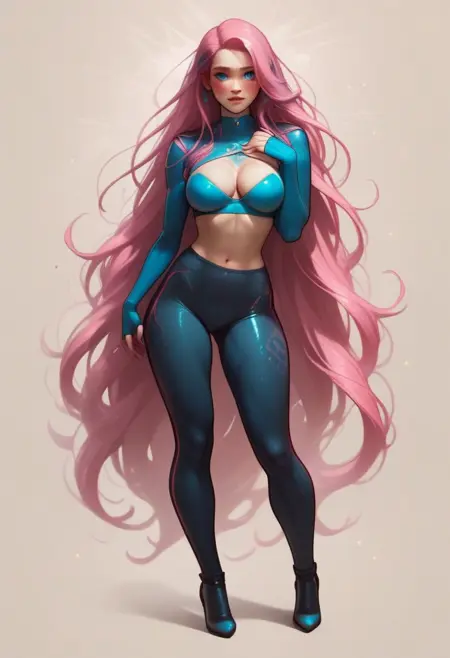 Hair: Cascading waves of pink and blue, representing the balance between chaos and serenity.