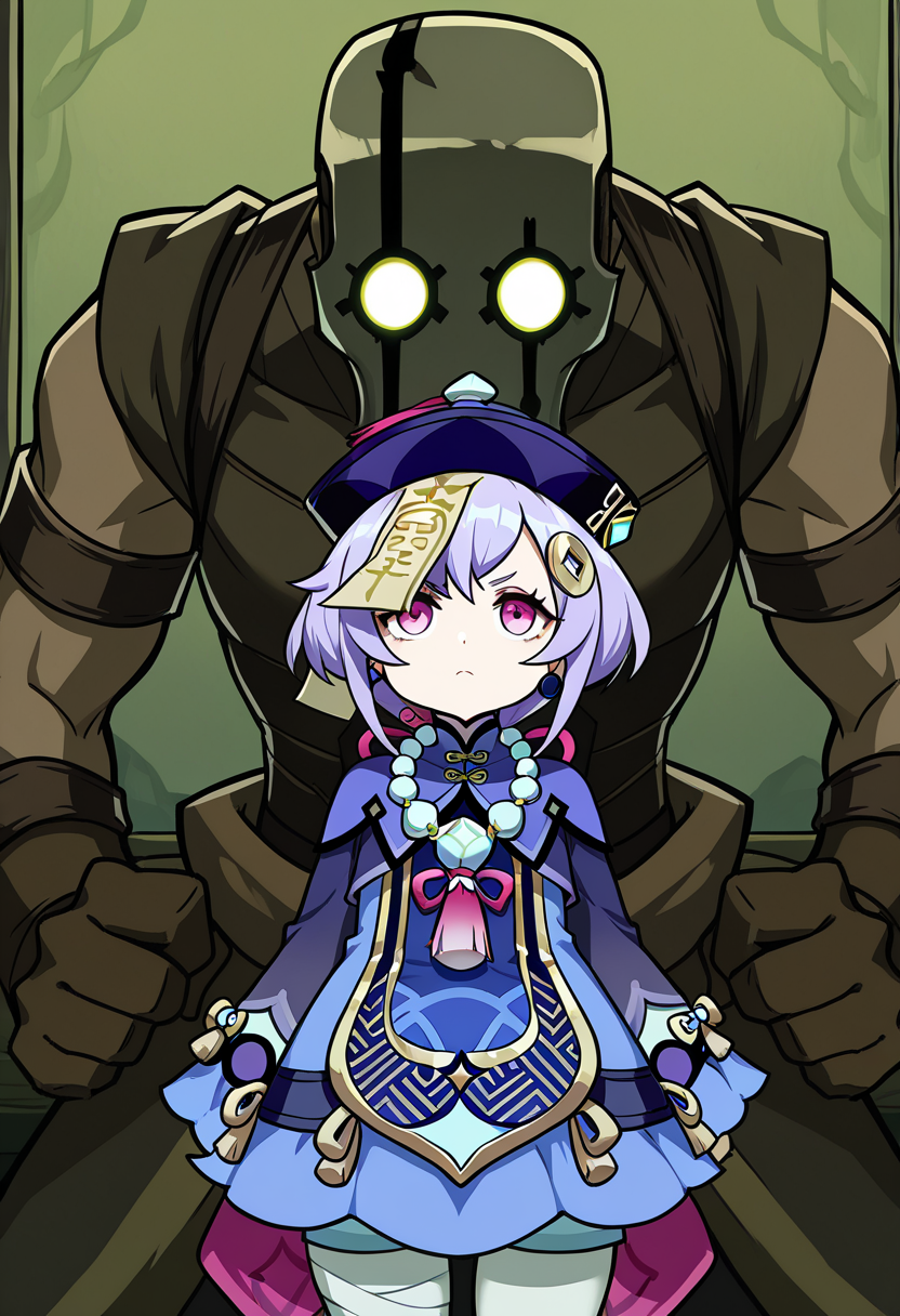 光る立方体を持ち、エリアキューブ、損傷した体、損傷したマスク、陰気な目、阿弥陀笠、マント、青いフード、観覧者を指差す