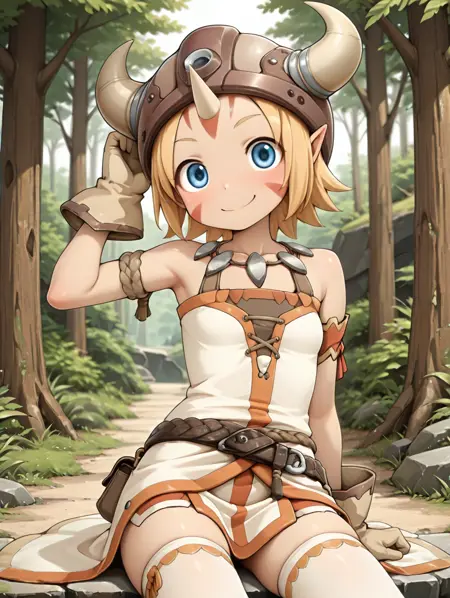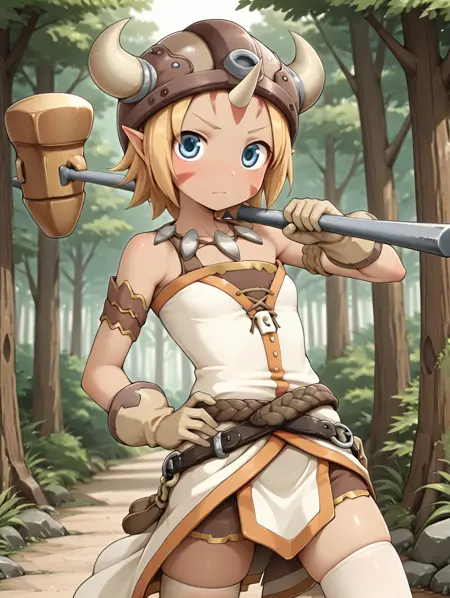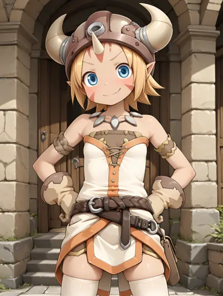 고브, 금발 머리, 뾰족한 귀, 단발, 파란 눈, 얼굴 무늬, 헬멧, 뿔, 단일 뿔, 흰색 옷, 장갑, 벨트, 목걸이, 흰색 허벅지 긴 양말,