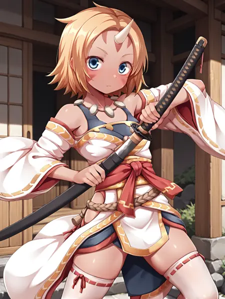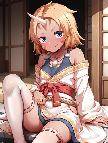 고브성인, 금발 머리, 뾰족한 귀, 단발, 파란 눈, 얼굴 무늬, 단일 뿔, 목걸이, 흰색 일본 복장, 흰색 허벅지 긴 양말, 넓은 소매,