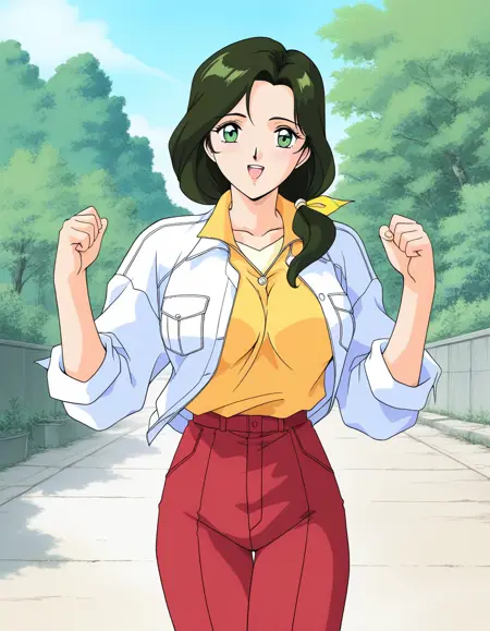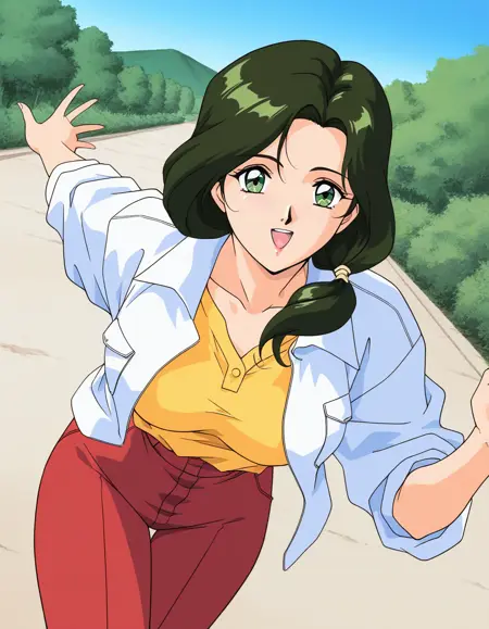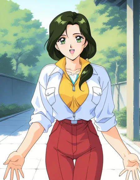 Sakurai_Sensei, 1girl, solo, dark green hair, long hair, green eyes, large breasts, low ponytail,