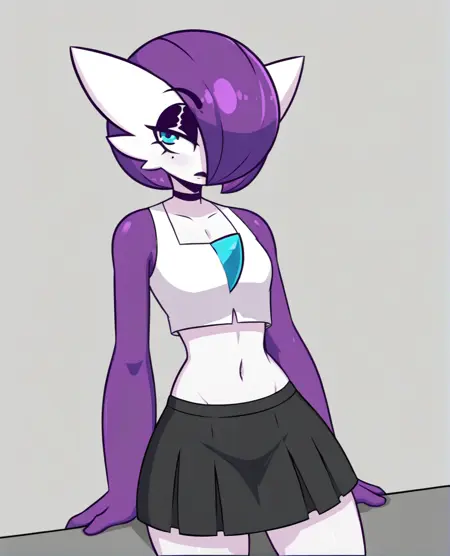 Tags: lav, purple hair, white skin, eyeshadow, hair over one eye, colored skin