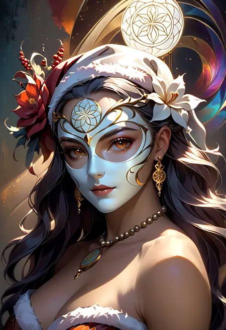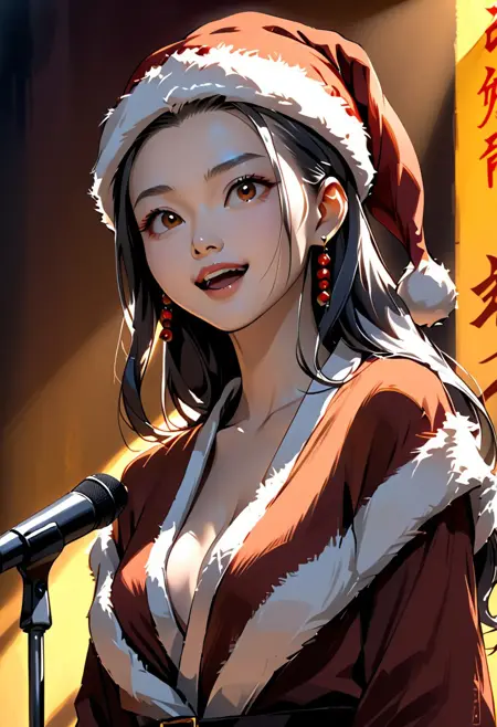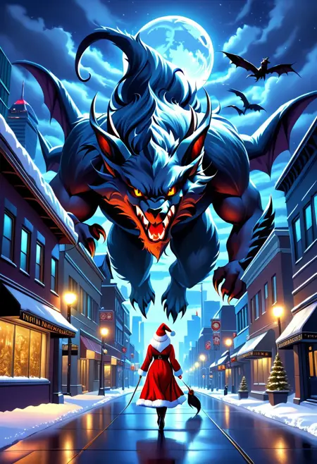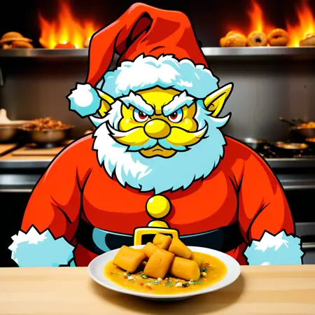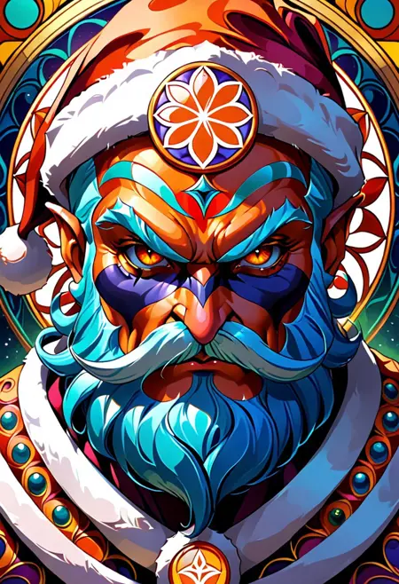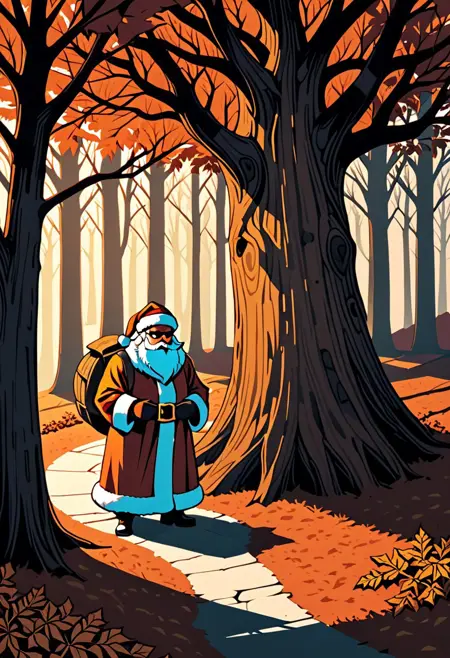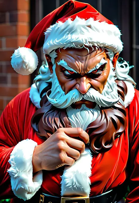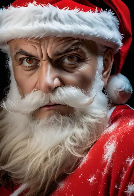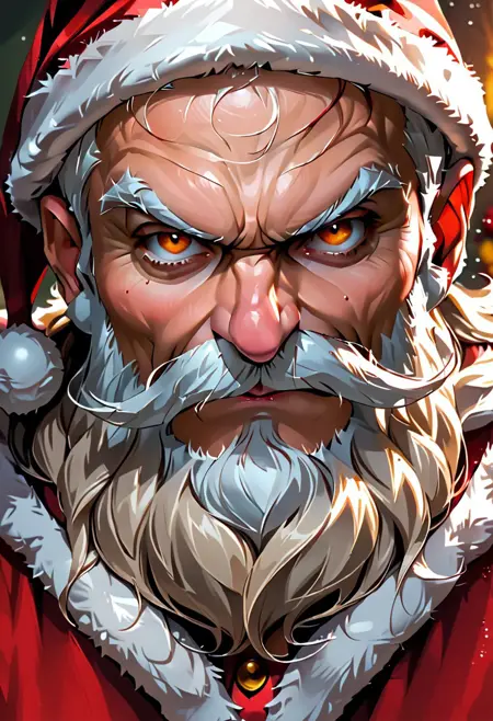 画像に不気味な祝祭的な雰囲気を生み出し、キャラクターにはサンタの衣装を着せ、キャラクターでないプロンプトには色を濃くし、いくつかの祝祭的な装飾を加え、しばしばサンタを追加します。