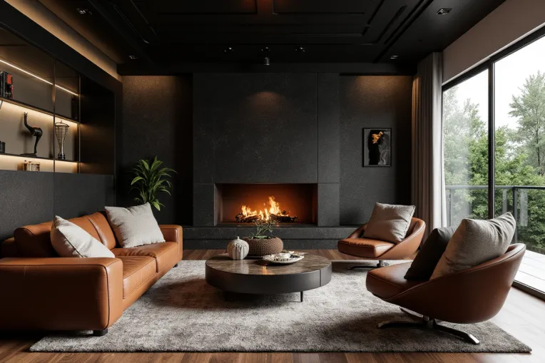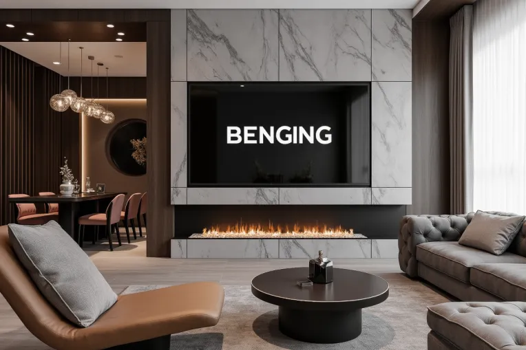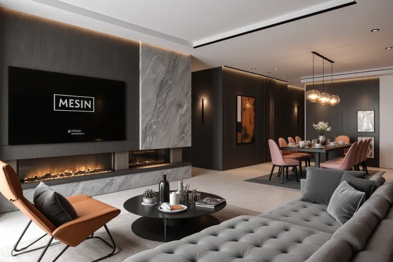 画像には、洗練されたミニマルな装飾の現代的で高級なリビングルームが描かれています。部屋には、太い白文字の大型壁掛けテレビが設置されており、その下にはスリムで内蔵型のリニアな暖炉が置かれ、温かみと雰囲気を加えています。壁はグレーの大理石とダークウッドのパネルで仕上げられ、豊かでエレガントなコントラストを生み出しています。座るスペースには、スタイリッシュで低めのタン色のラウンジチェアと、ふっくらとしたグレーのクッション、グレーのタフティング加工されたセクショナルソファ、そして装飾品が置かれた円形のコーヒーテーブルがあります。背景にはダイニングエリアが見え、ダークなダイニングテーブルと、柔らかいピンクがかった茶色のクッション付きの椅子が取り囲んでいます。天井からは、ガラス製の球体を持つペンダントライトがダイニングエリアの上に吊り下げられ、現代的な洗練を加えています。部屋は埋め込み式の天井灯と柔らかな間接照明で照らされており、空間の質感と色合いを引き立て、快適でありながら洗練された雰囲気を生み出しています。