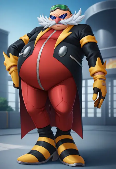 Eggman Nega, white moustache, bald, dark blue sunglasses, goggles on head, black jacket, red shirt, yellow and black socks, evil grin