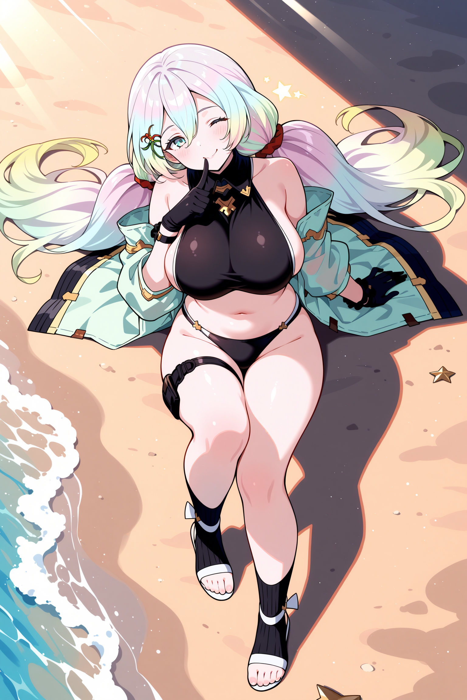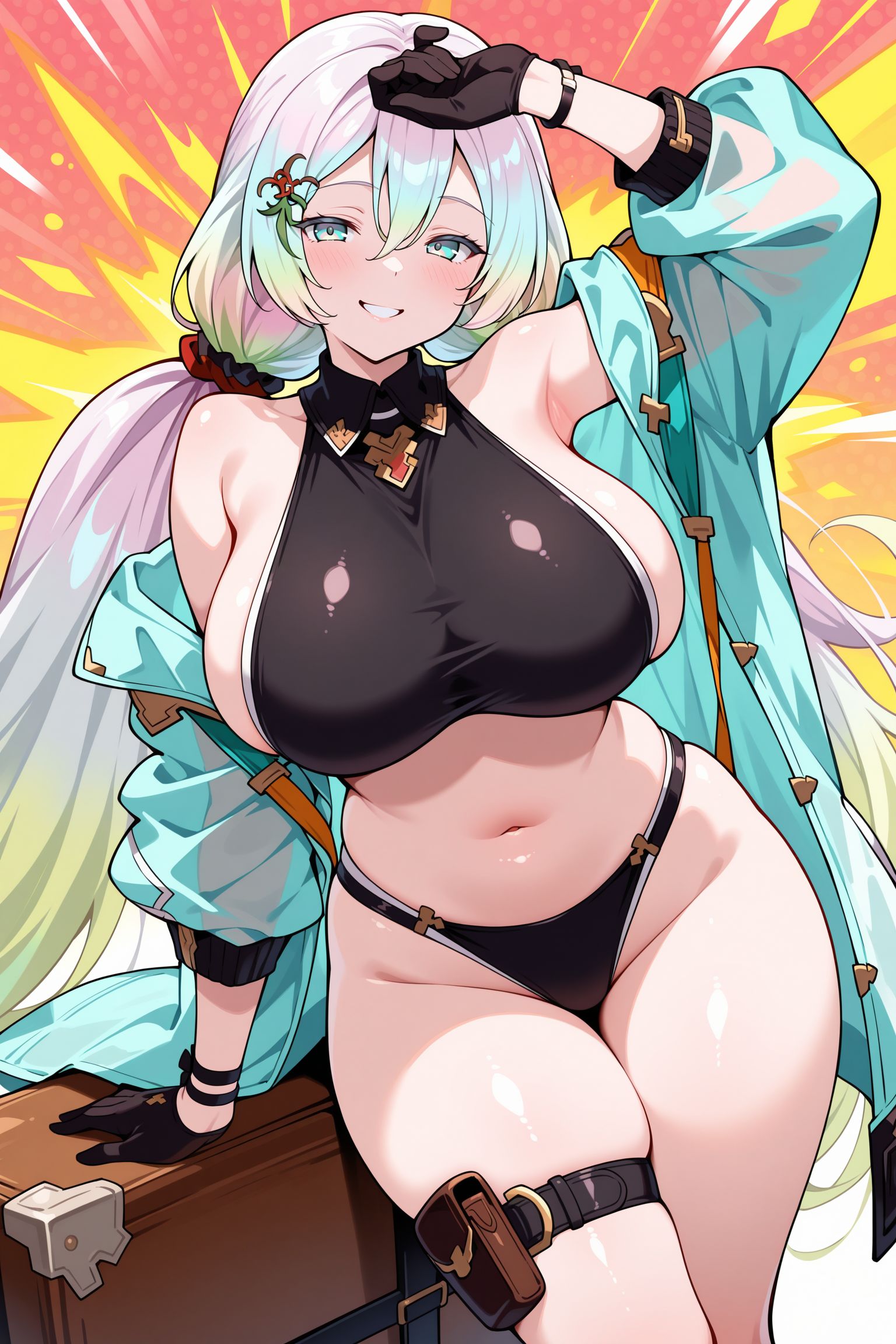 bare shoulders, gloves, thigh strap, black bikini,