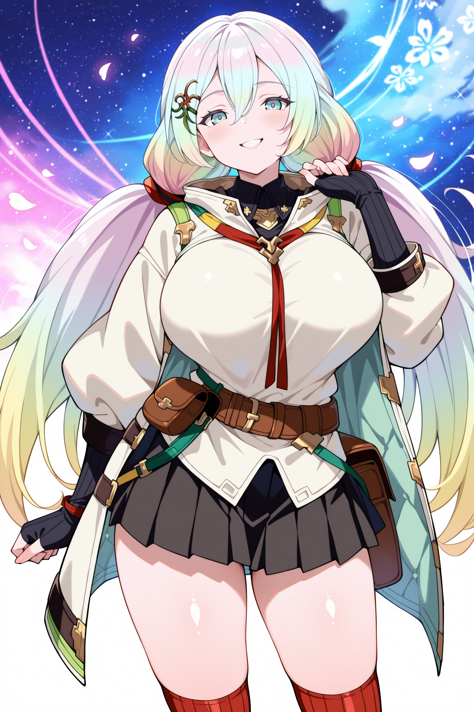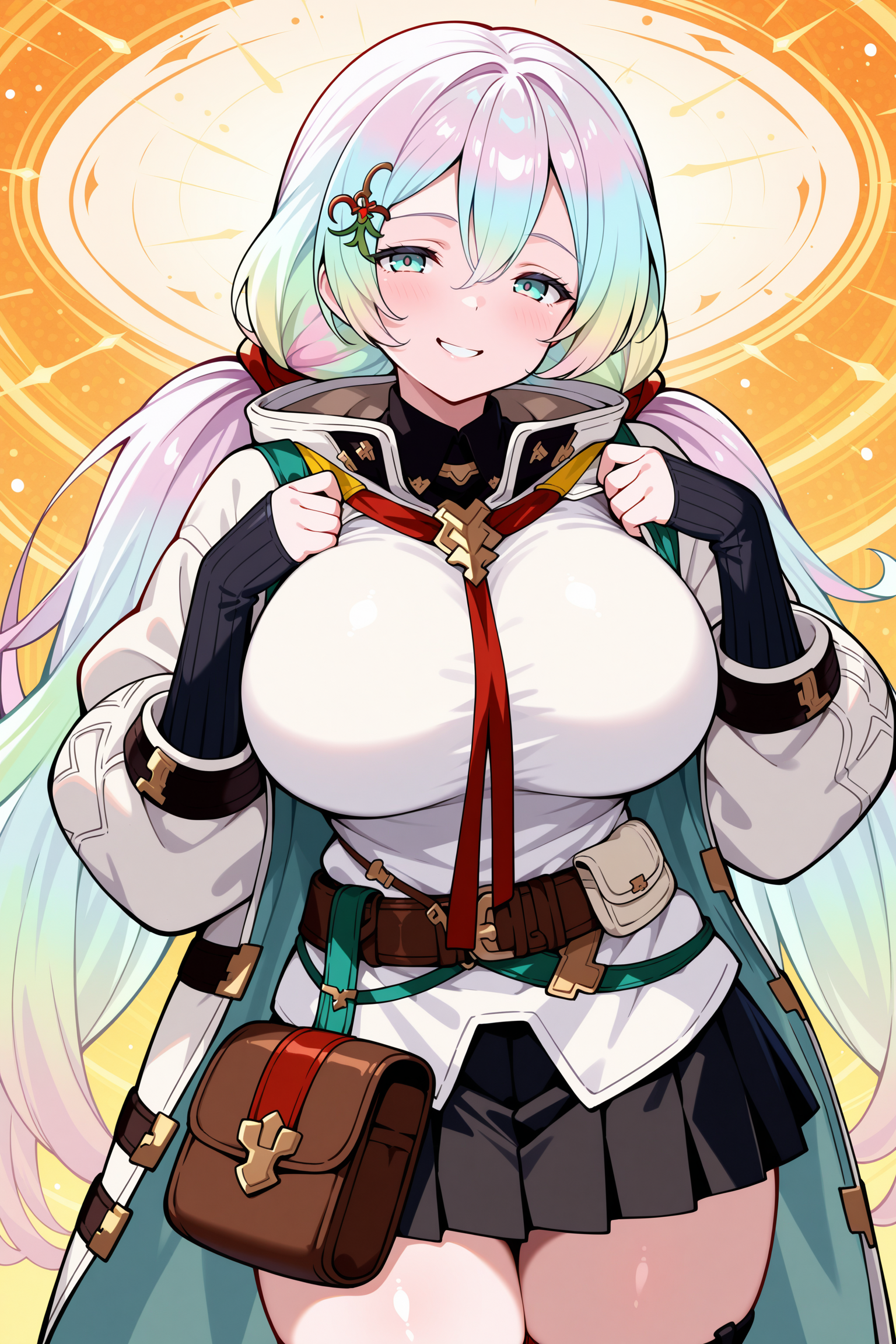 hair ornament, pouch, belt, bag, long sleeves, black miniskirt, jacket, pleated skirt,