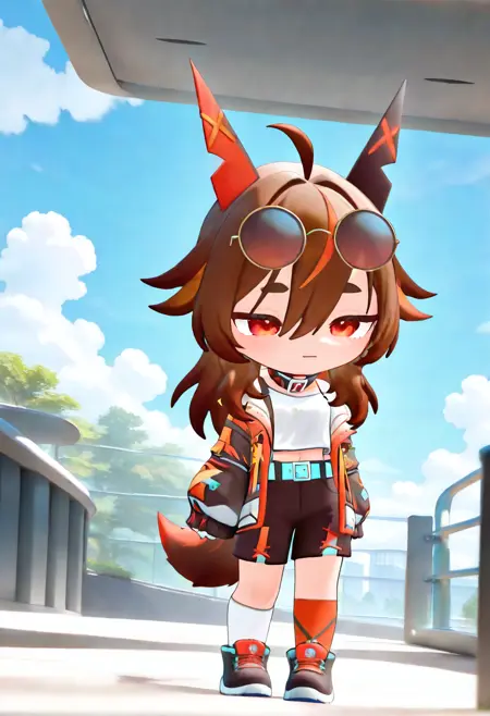 garm420, 1girl, socks, tail, jacket, brown hair, shoes, virtual youtuber, navel, asymmetrical legwear, eyewear on head, shorts, kneehighs, sleeves past wrists, horns, off shoulder, belt, shirt, long hair, ahoge, multicolored hair, white shirt, sunglasses, long sleeves, round eyewear, hair between eyes, open jacket, collar, black footwear, midriff, open clothes, black shorts, red eyes, single sock, uneven legwear, streaked hair, mismatched legwear, sleeves past fingers, animal ears, single kneehigh,