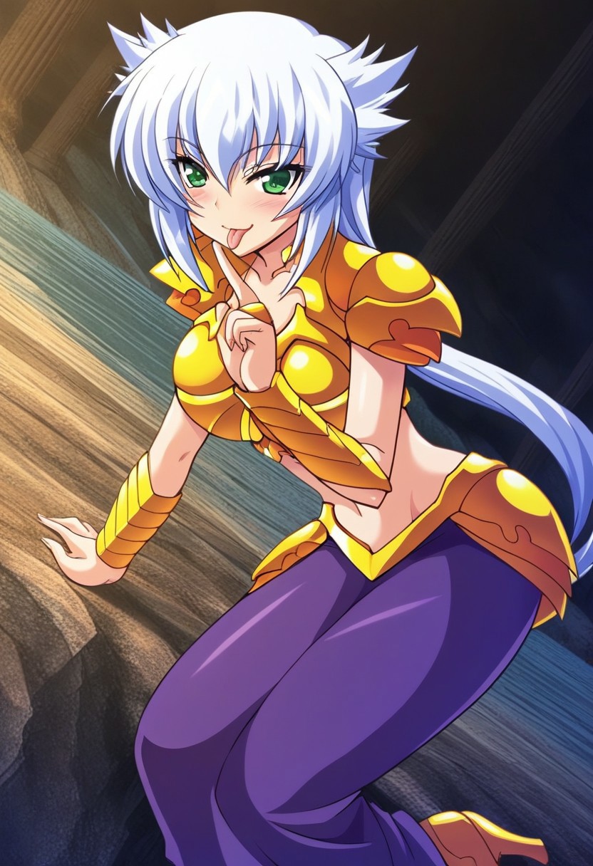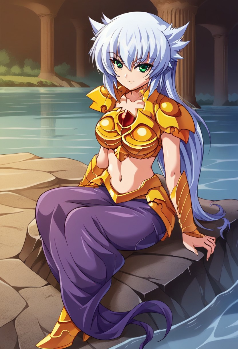 gold plate armor, gold armored bra, gold bracelet, gold bracer, gold spaulders, purple pareo, gold high heeled boots,