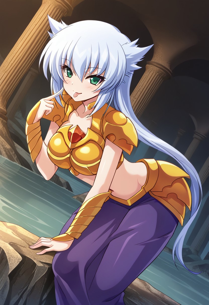 white ankle length hair, kemonomimi hair, sidehair, spiky bangs, tsurime green eyes,