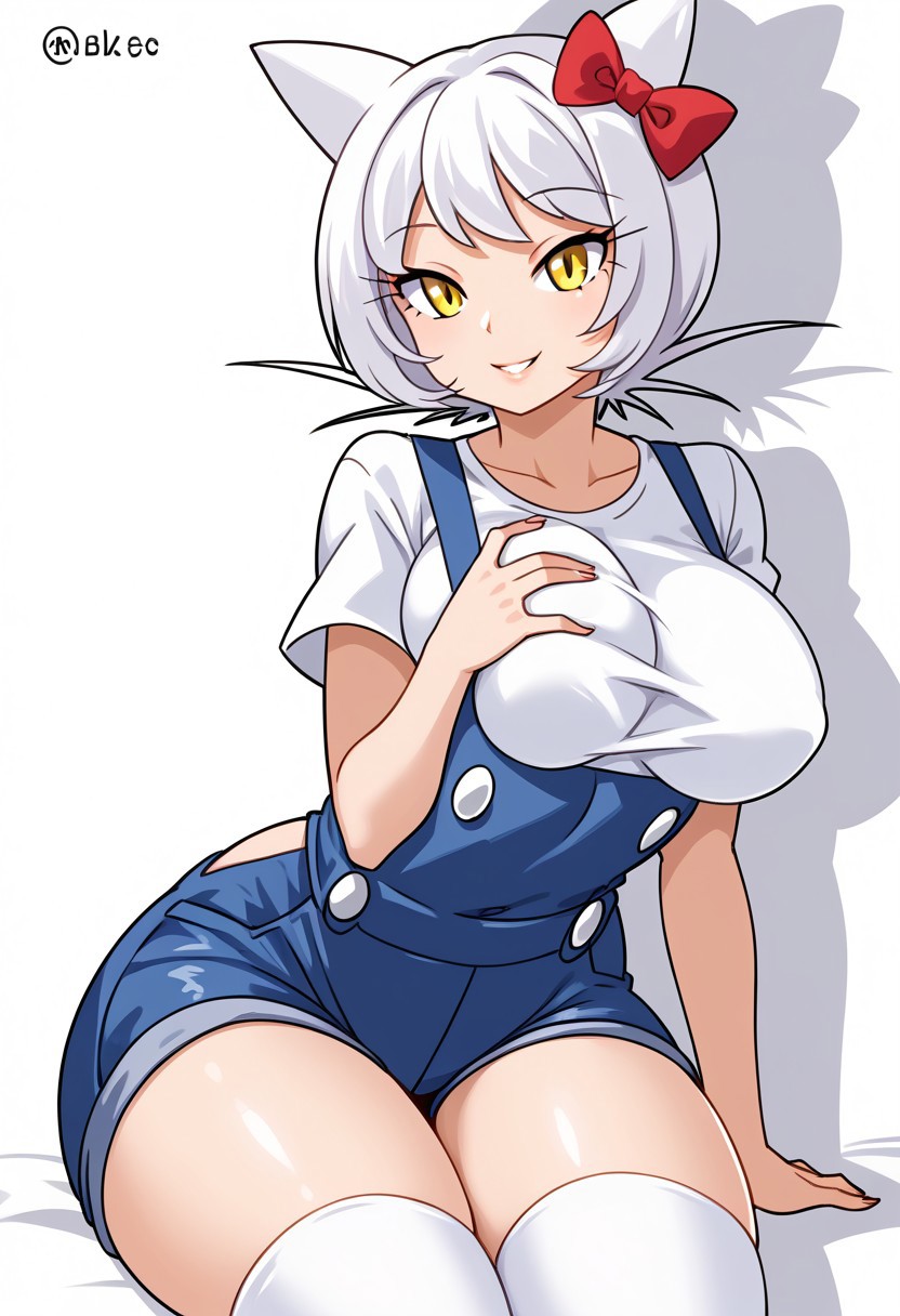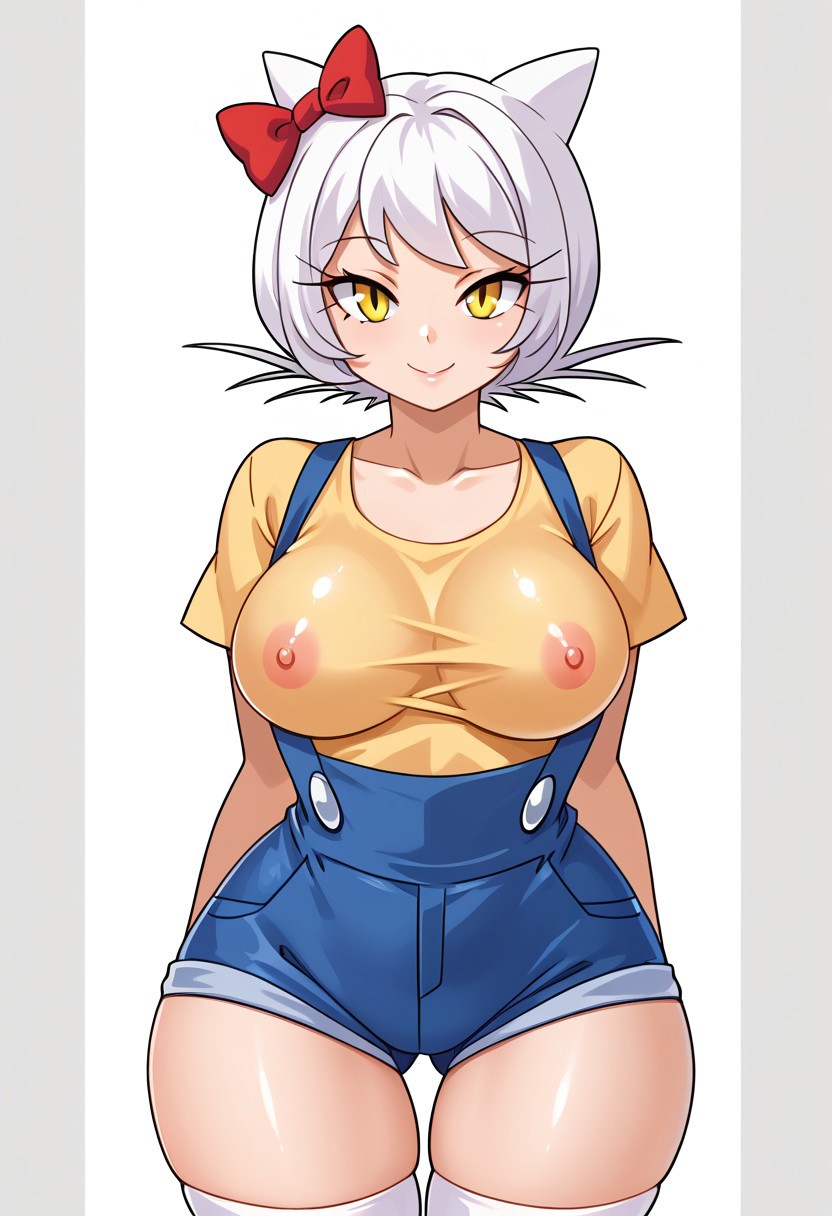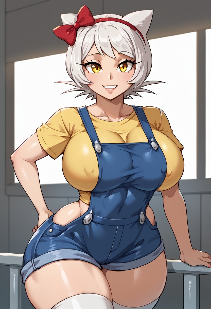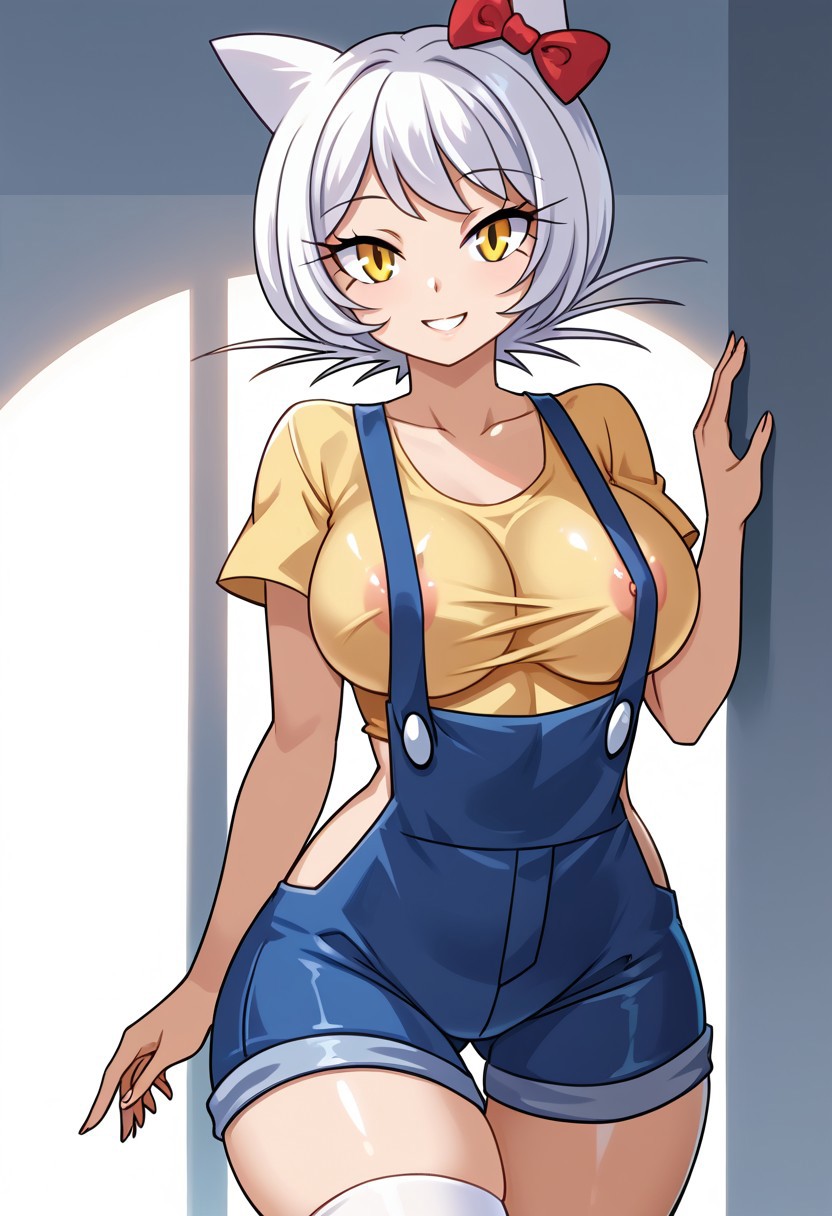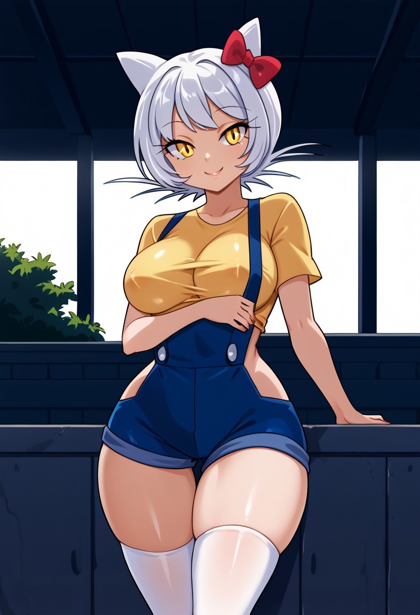 HK_M8, 1girl, yellow eyes, white hair, short hair, cat ears, big breasts, curvy, yellow shirt, short sleeves, denim overalls, bow ornament, red bow, short overalls, white stockings