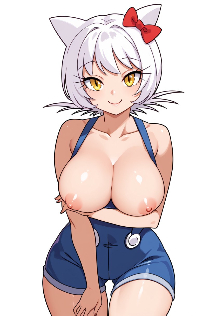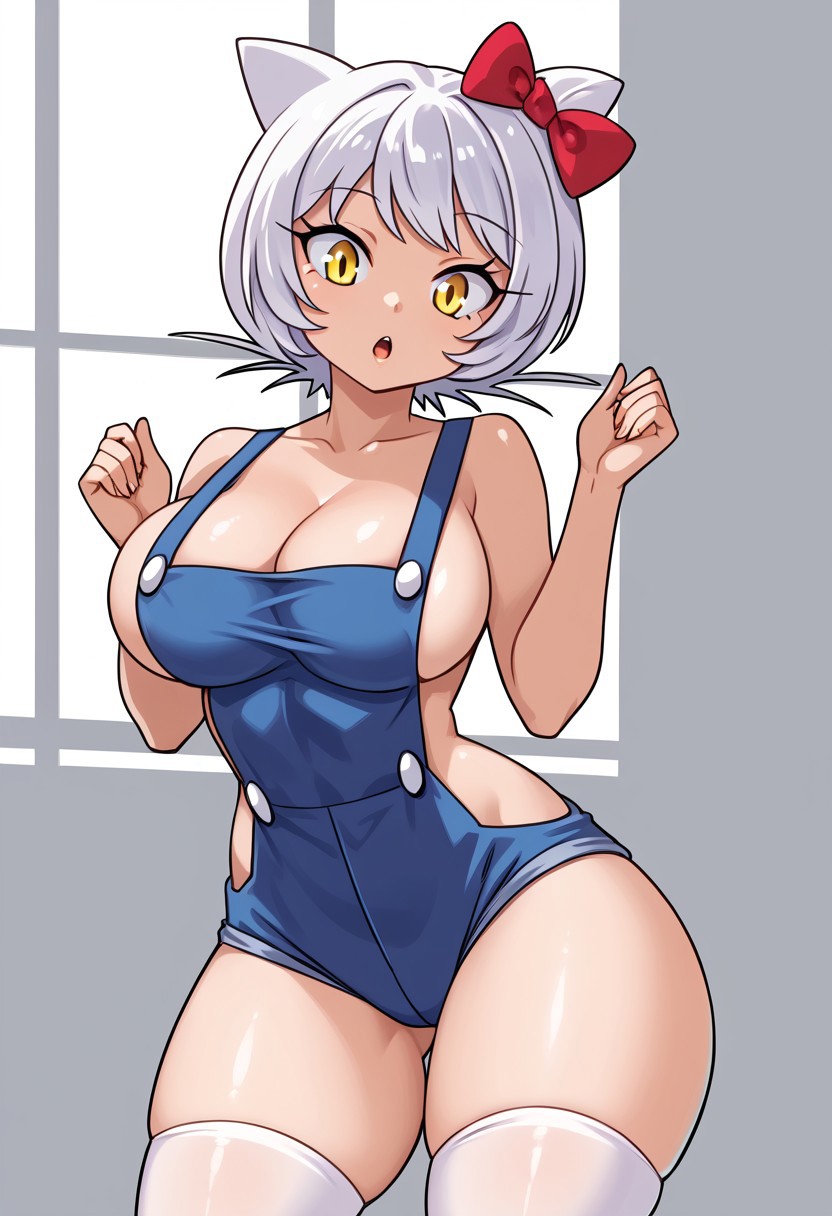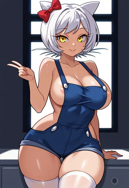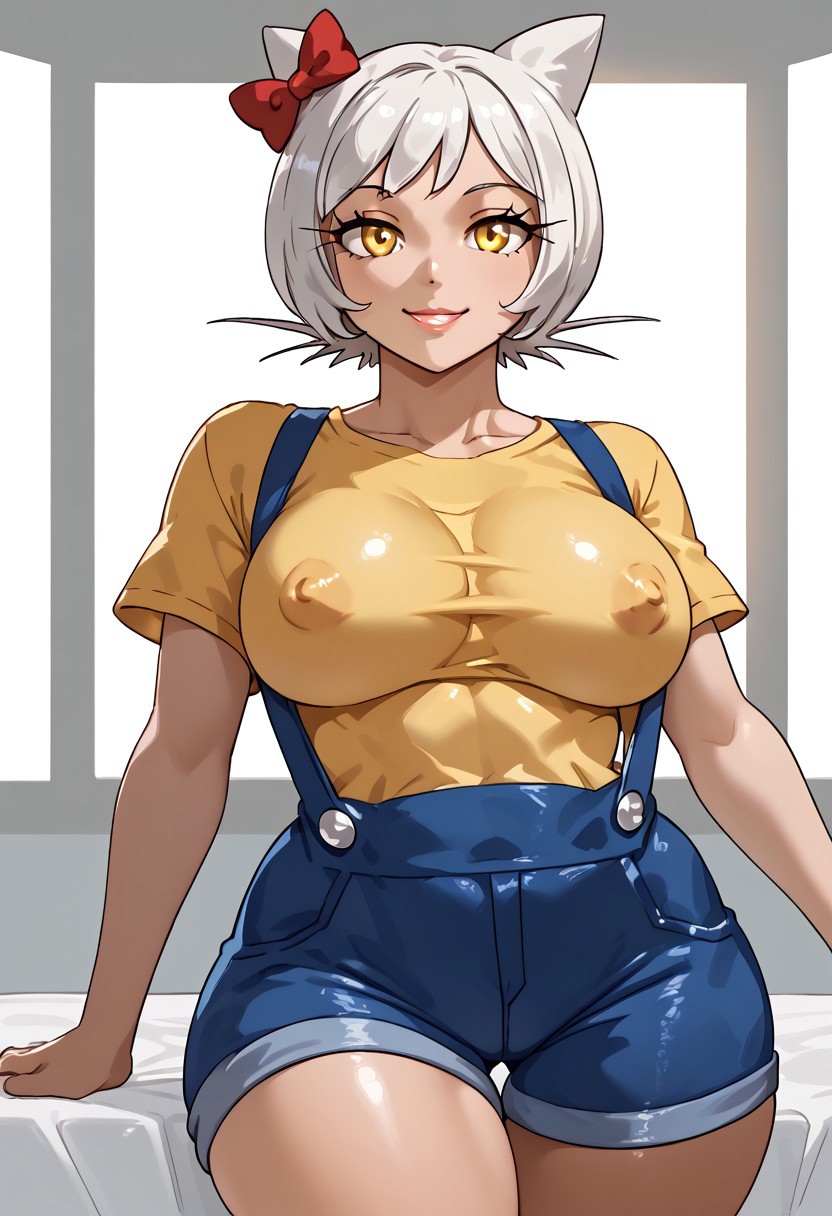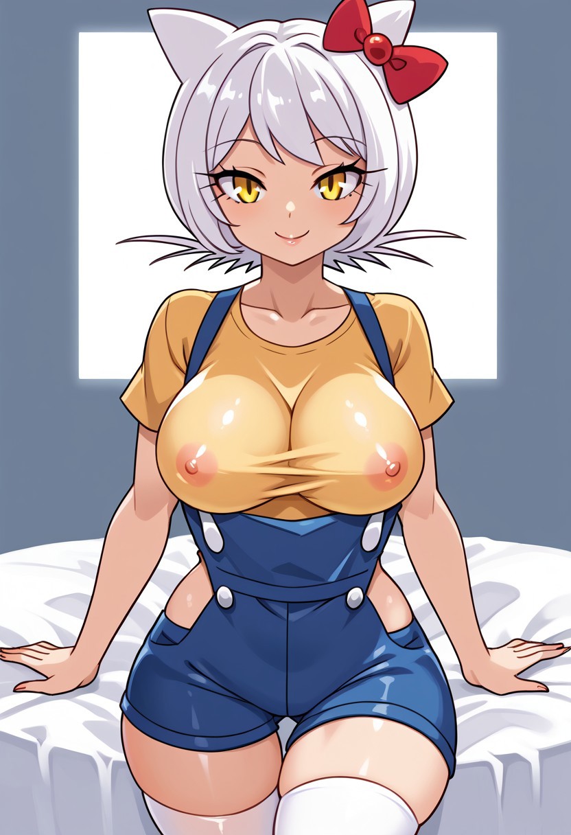 HK_M8, 1girl, yellow eyes, white hair, short hair, cat ears, big breasts, curvy, yellow shirt, short sleeves, denim overalls, bow ornament, red bow, short overalls, white stockings