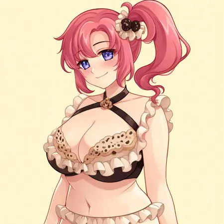 Lingerie: frilled beige bikini, straps, oreo cookie hairtie,