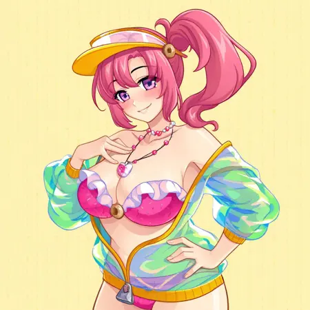 Bathing suit: holographic jacket, unzipped jacket, see-through jacket, frilled pink bikini, pink necklace, yellow visor cap,