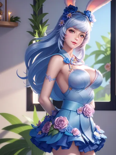 - WZRYgongsunliHJW, 1girl, hair flower, solo, hair ornament, blue eyes, long hair, rabbit ears, dress, single thighhigh, smile, looking at viewer, blue flower, detached sleeves, jewelry, bare shoulders, choker, cityscape, night,