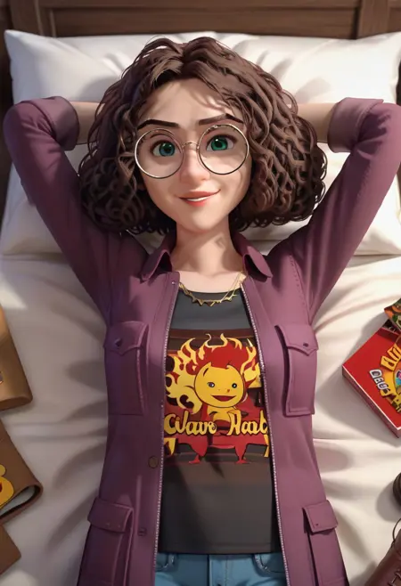 Trigger words: 1girl, Solo, Tara_HI, light skin, green eyes, round glasses, dark brown eyebrows, dark brown hair, short hair, voluminous curly hair, pink lips, purple jacket, black t-shirt with print, blue skinny jeans, brown boots, bracelet, gold necklace