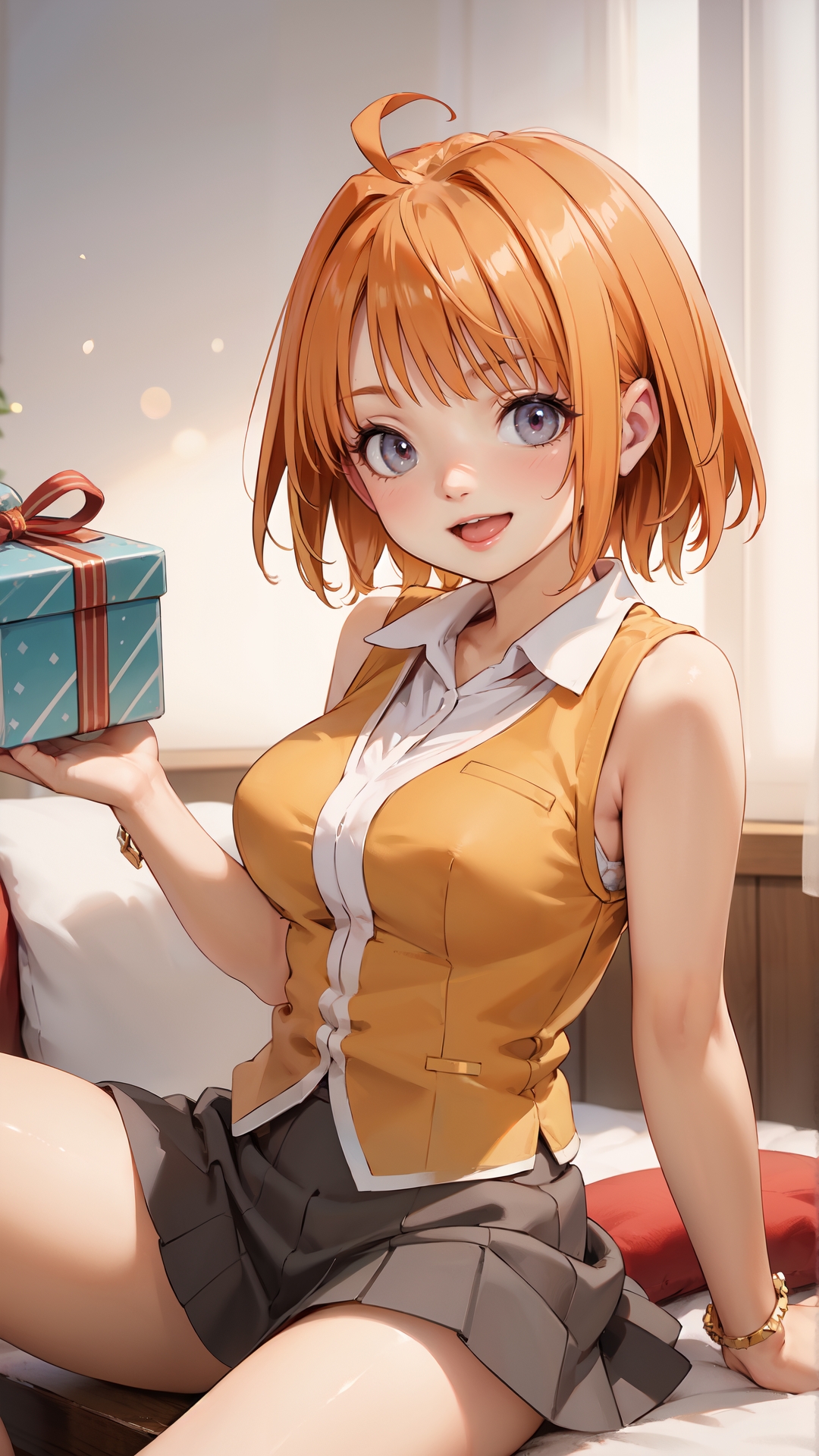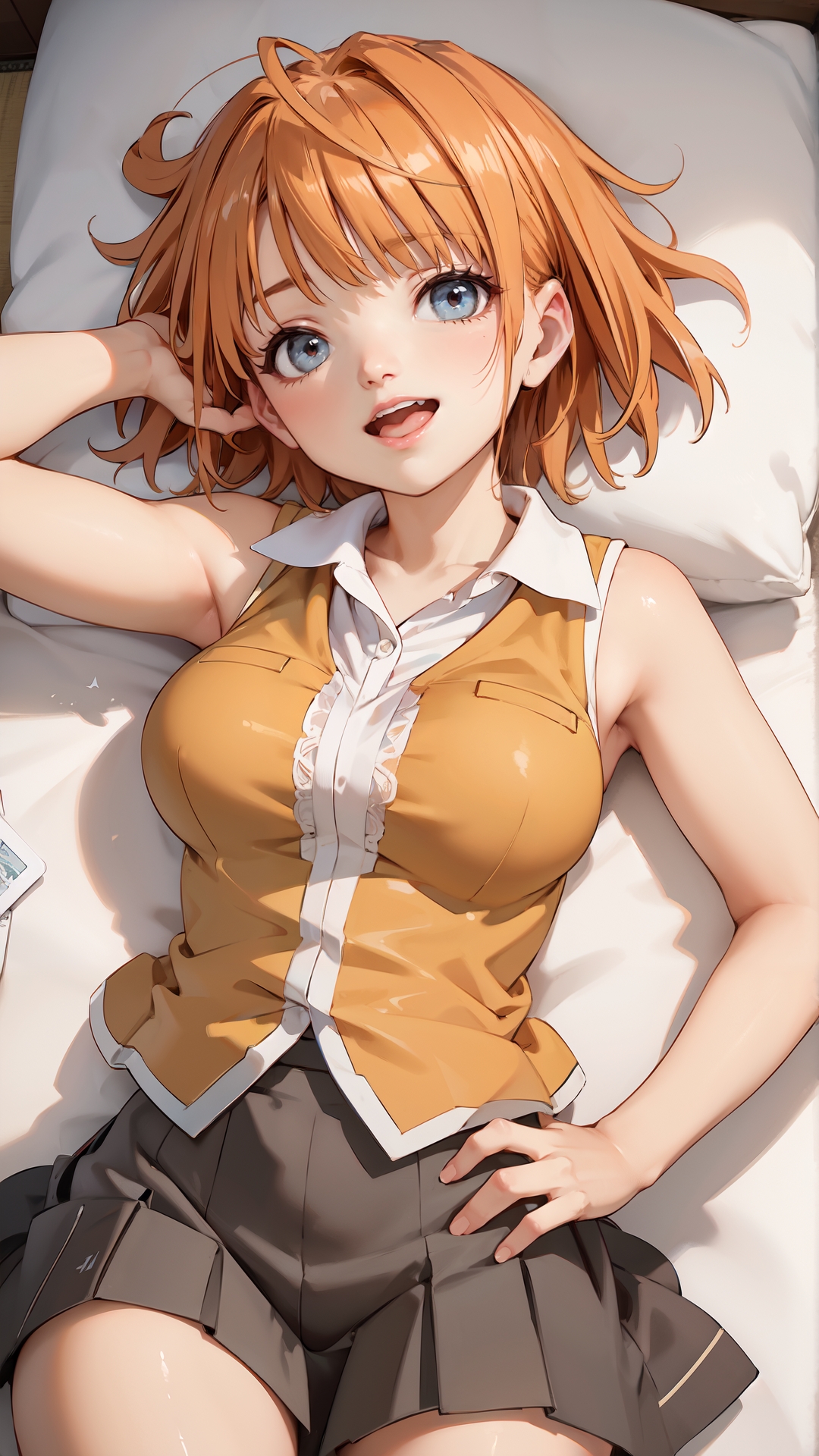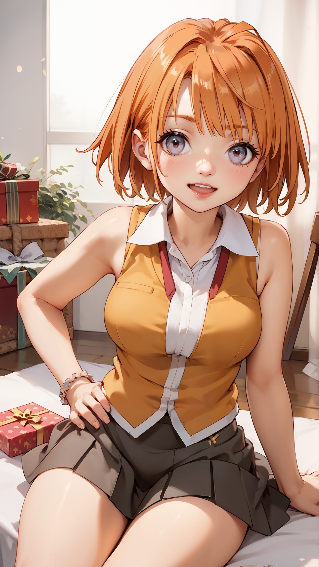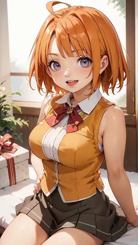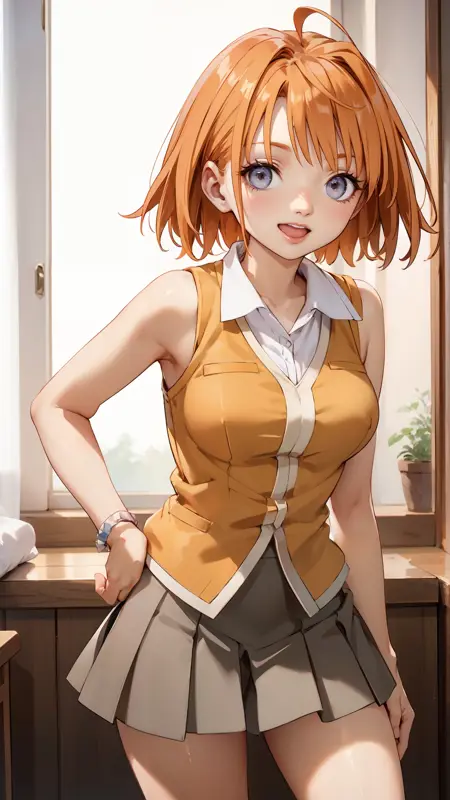 Example prompt : "tokiha_mai, an anime girl, 1girl, solo, breasts, looking at viewer, smile, short hair, open mouth, skirt, large breasts, simple background, shirt, white background, bare shoulders, school uniform, purple eyes, ahoge, pleated skirt, sleeveless, orange hair, hand on hip, oekaki, orange shirt, orange vest"