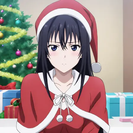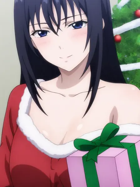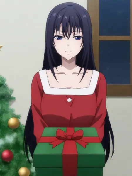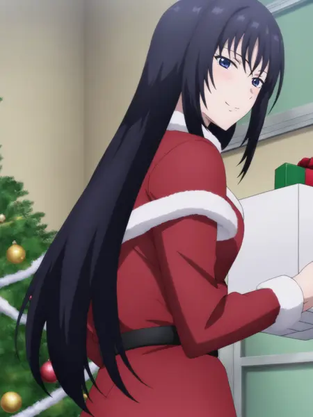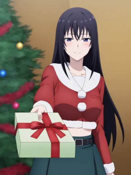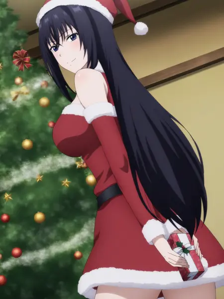 lora:Shiho\_Sawaragi-000004:0.8 15_Shiho_Sawaragi_School_UniformWoman, long black hair, bangs, hair between eyes, blue eyes, light skin, medium size breast , 1girl, solo, Christmas, Christmas tree, red clothes, custom, seductive smile, giving giftbox to the viewer.