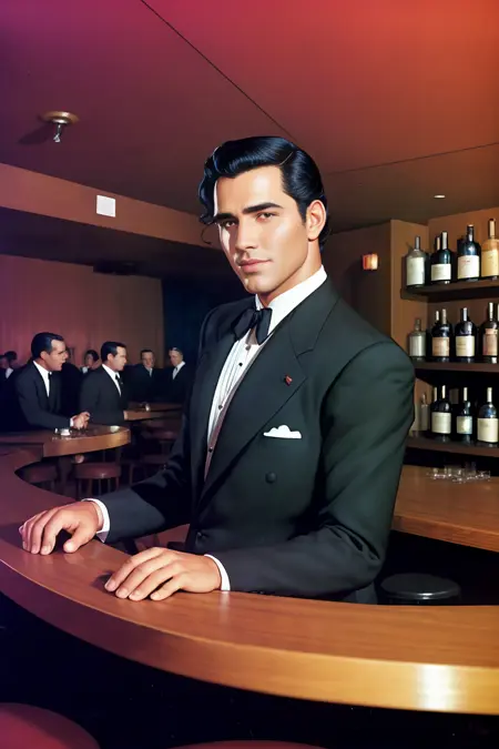 このLoRAは、1960年代のアメリカのバーとナイトクラブのヴィンテージ画像で学習されました。木製パネルで飾られた内装、会場の陰影のある照明、そして客たちの洗練された服やヘアスタイルを捉えています。