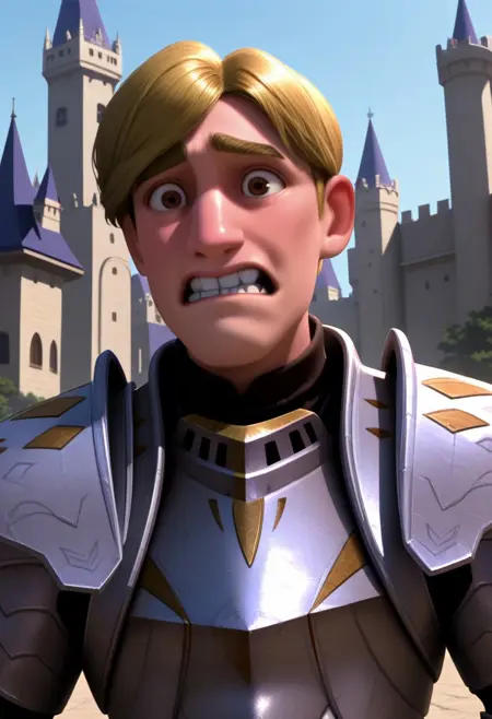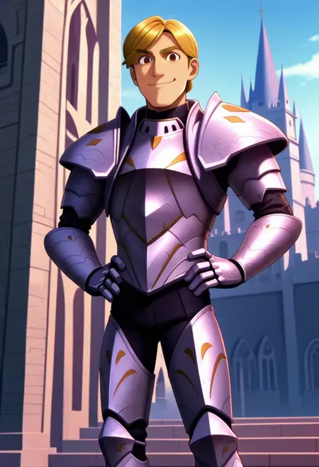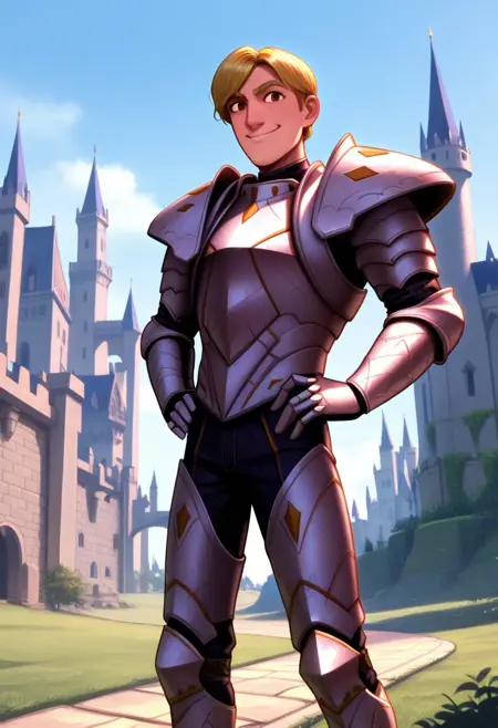 stevepalchuck, 1boy, male focus, solo, brown eyes, blonde hair, short hair, thick eyebrows, armor, full armor, breastplate, shoulder armor, pauldrons, gauntlets, armored boots,