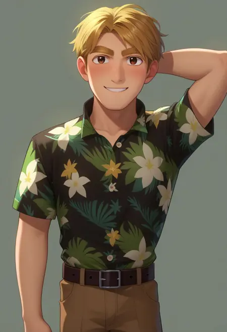 stevepalchuck, 1boy, male focus, solo, brown eyes, blonde hair, short hair, thick eyebrows, shirt, blue shirt, polo shirt, short sleeves, belt, pants, brown pants