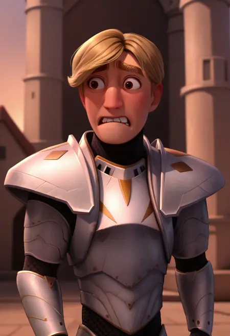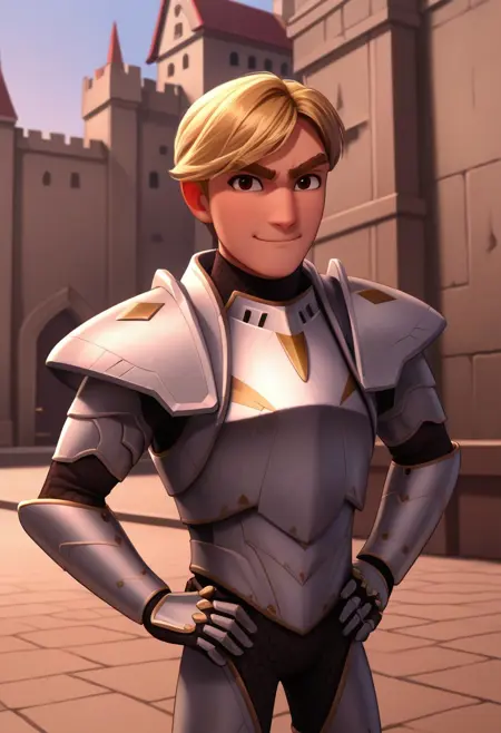 stevepalchuck, 1boy, male focus, solo, brown eyes, blonde hair, short hair, thick eyebrows, armor, full armor, breastplate, shoulder armor, pauldrons, gauntlets, armored boots,