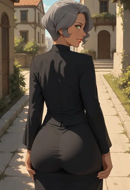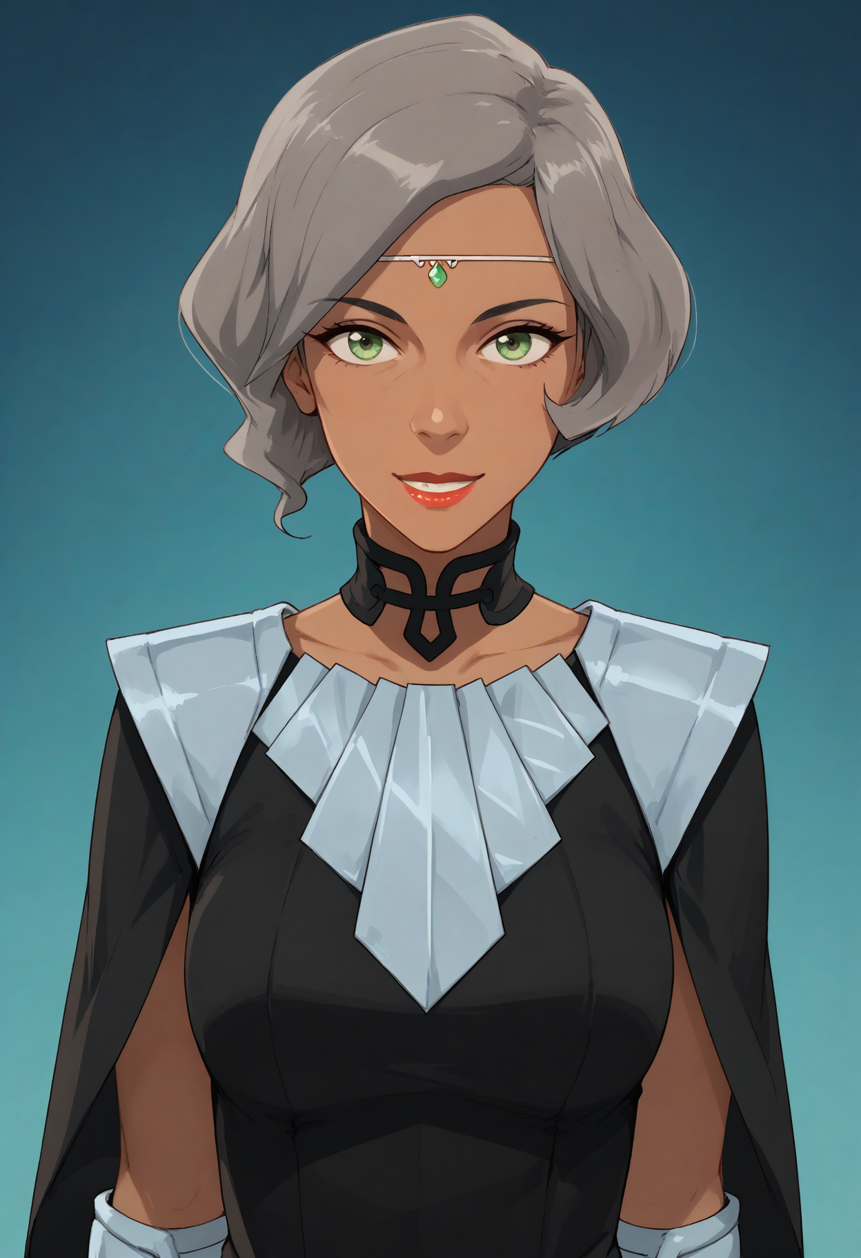 주요 태그: 1girl, solo, 녹색 눈, 회색 머리, 단발, 검은 피부 여성, 검은 피부, 메이크업, 립스틱, 가슴, 드레스, 검은 드레스, 이마 보석, 원형 머리장식,