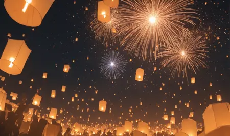 イェンペン祭りは、タイのラナー地域の重要な祭りで、陰暦12月の満月の日に開催されます。光の美しさを祝い、吉兆を招き、願い事を叶えるために空にロウソクランタンを放ちます。また、ランタンの飾り付け、 merit(功徳を積む行為)、そして美しい雰囲気の中でのランタンパレードが行われます。
