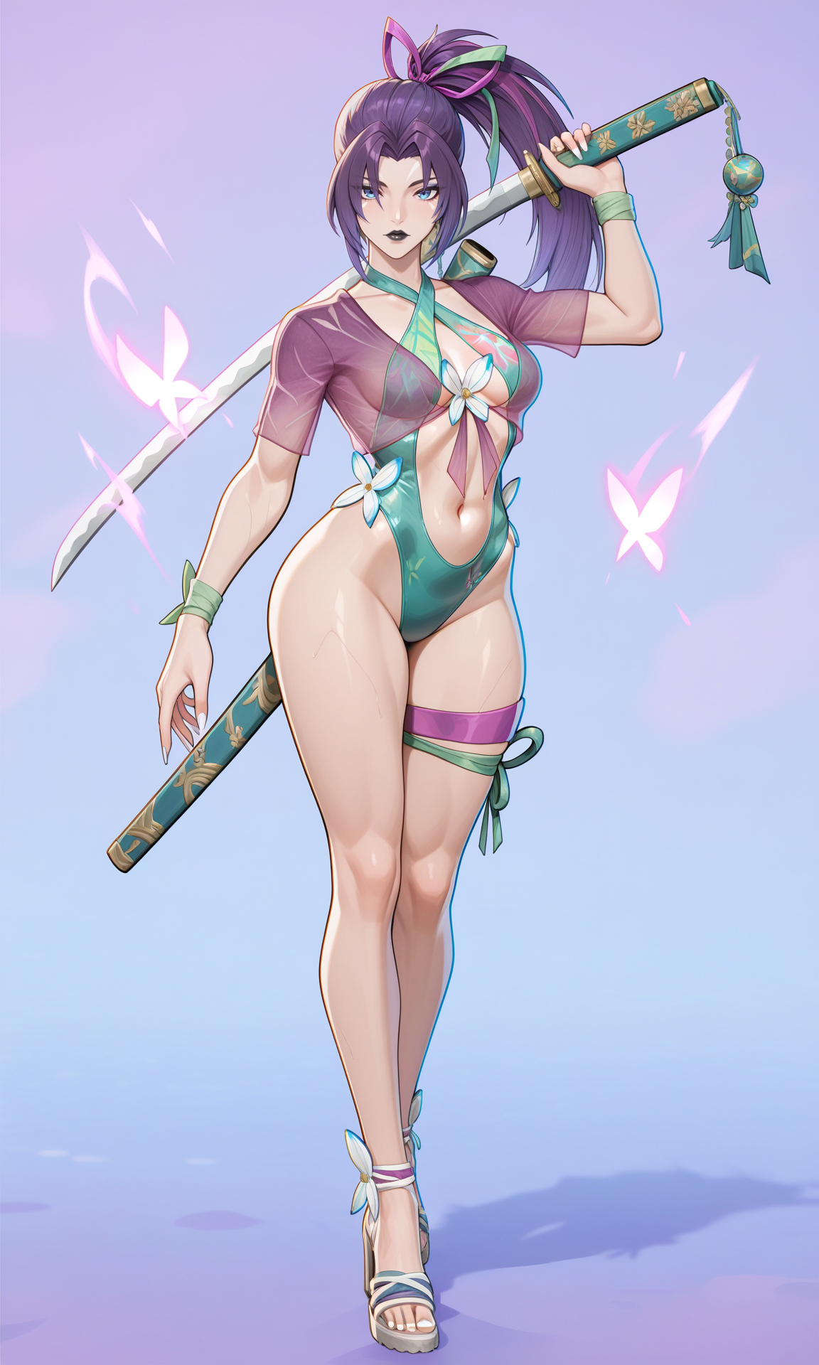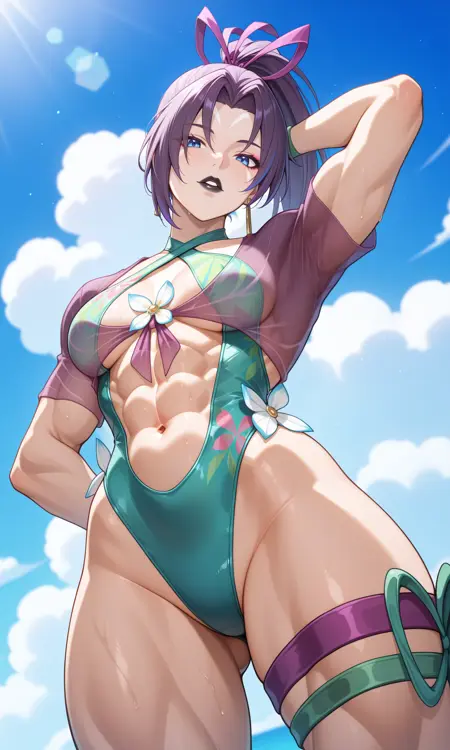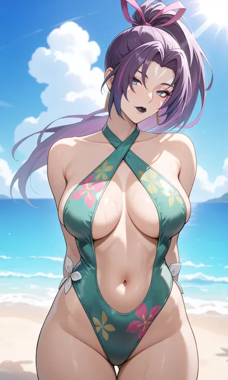| 训练词汇 | psylckmrsw1m, blue eyes, purple hair, streaked hair, mulitcolored hair, long hair, high ponytail, parted bangs, hair ribbon, purple ribbon, earrings, facial mark, black lips, lipstick, makeup, purple crop top, see-through crop top, short sleeves, brooch, green armband, swimsuit, casual one-piece swimsuit, green one-piece swimsuit, highgleg one-piece swimsuit, criss-cross halter, floral print, white flower, stomach, navel, linea alba, innerboob, nail polish, white nails, single thigh strap, purple thigh strap, thigh ribbon, green ribbon,已复制! |