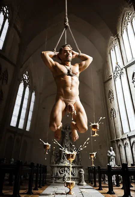 (golden) holygrail, below view/above view/side view, bondage, BDSM, hanging, suspension.