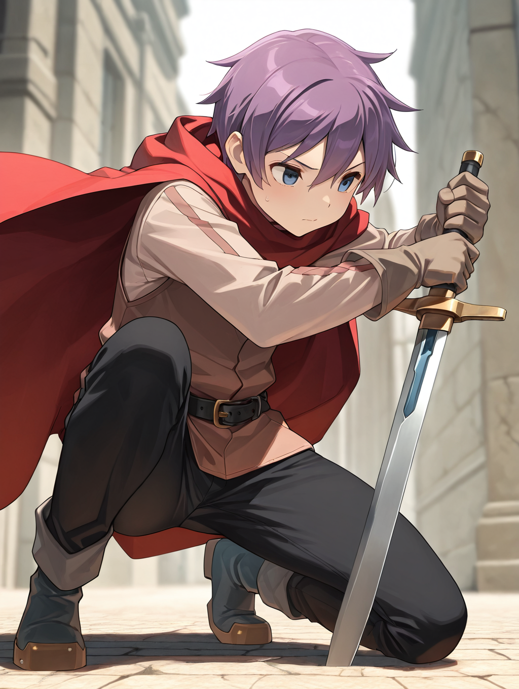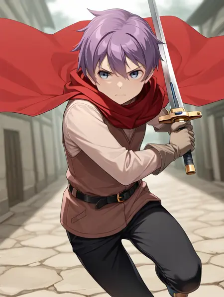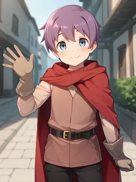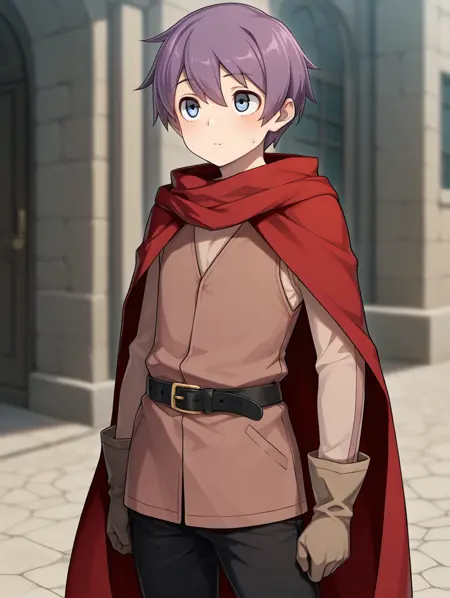 Luka,紫发,短发,蓝眼睛,红色斗篷,棕色背心,米色衬衫,长袖,腰带,黑裤,手套,