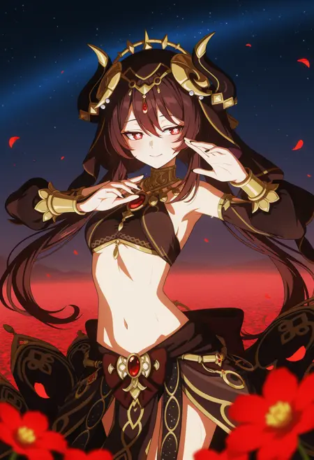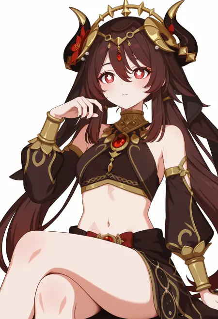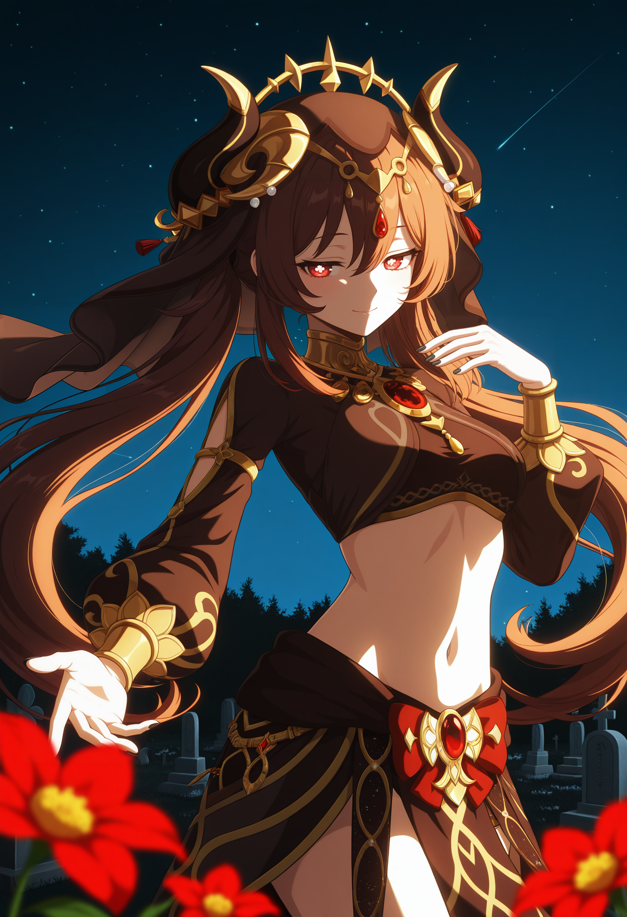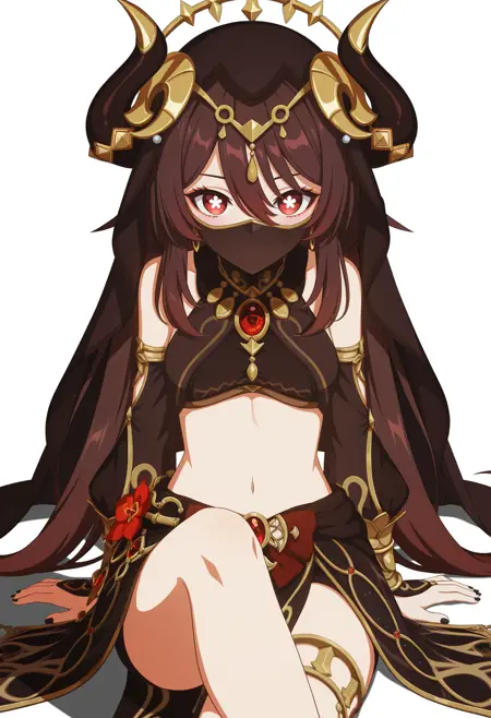 • Hulou_(wiehhg_cos),solo,long hair,brown midriff,flower-shaped pupils,horns,navel,red eyes,black nails,brown hair,alternate costume,twintails,hair ornament,brown veil