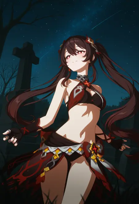 • Hulani_(wiehhg_cos),solo,long hair,flower-shaped pupils,navel,red eyes,black nails,brown hair,twintails,fingerless gloves,swimsuit,red skirt