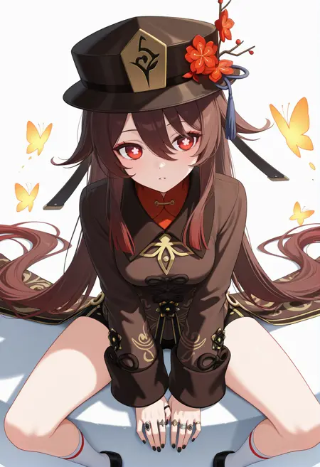 • flower-shaped pupils,white socks,brown hair,ring,long hair,flower,hat,brown coat,red eyes,black shorts,twintails,jewelry,hat flower,chinese clothes,black shoes,black nails,multiple rings