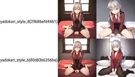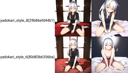由于数据集中每个角色出现频率较低,Yadokari 作品的角色特征还原效果可能不稳定。不过,通过在提示中明确描述角色特征,通常能有效提升识别准确性,模型也已学习到部分特征。v8 模型在此方面有所改进(部分解决),但代价是使用便捷性和通用性有所降低。