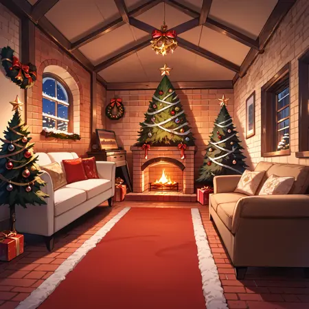 触发词:chrlib、风景、室内、客厅、夜晚、壁炉、圣诞树、圣诞装饰品、红地毯