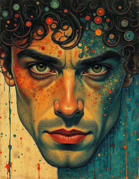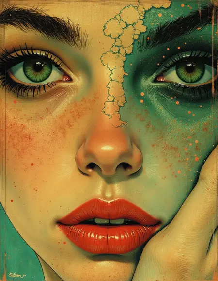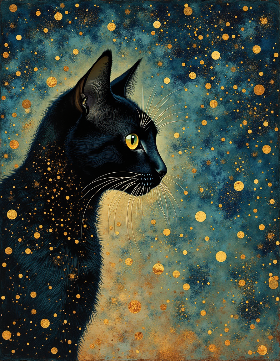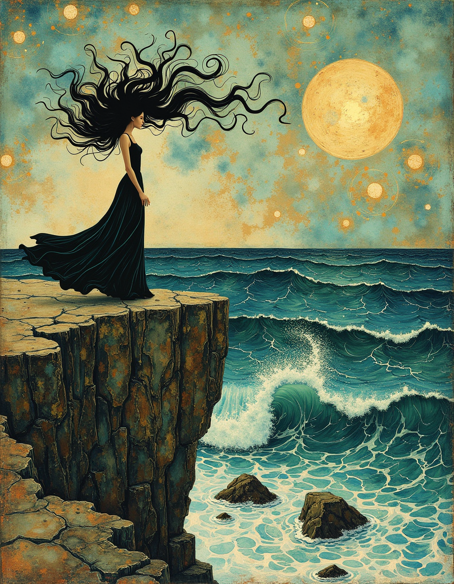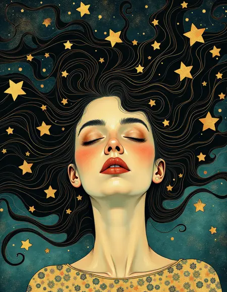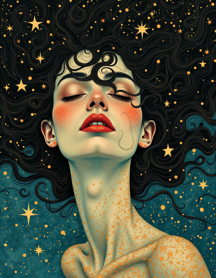 「ドリームランド」は、濃い青やゴールドなどの柔らかくも力強い色を使って作られる、夢幻的でエーテリアルな雰囲気が特徴です。このスタイルは、静けさとわずかな神秘性を組み合わせたものです。特に女性の髪や顔の細部が丁寧に描かれており、全体的な構図は夢や夜の風景のような印象を与えます。星や月に施されたゴールドの装飾が、ファンタジックで魔法のような雰囲気をさらに高めます。