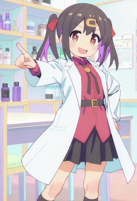 mihari-default,oyama mihari,brown eyes,black hair,multicolored hair,twintails,medium breasts,red hair ribbon,hairclip,labcoat,red shirt,long sleeves,belt,black skirt,black socks