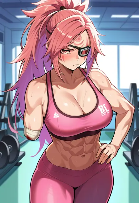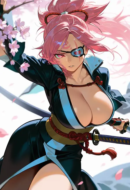 "BKNGG, 분홍색 머리카락, 큰 머리카락, 눈을 가로지르는 흉터, 분홍색 눈, 안대, 얼굴 문신, 큰 가슴, 일본 복장, 기모노, 띠"