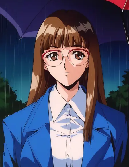 Iijima_Sensei, 1girl, solo, brown hair, glasses, long hair, brown eyes, blunt bangs, large breasts, 1990s (style), anime coloring,