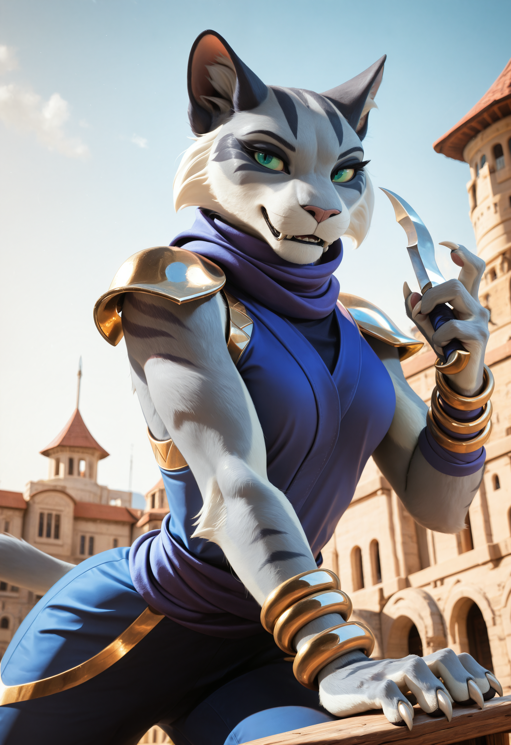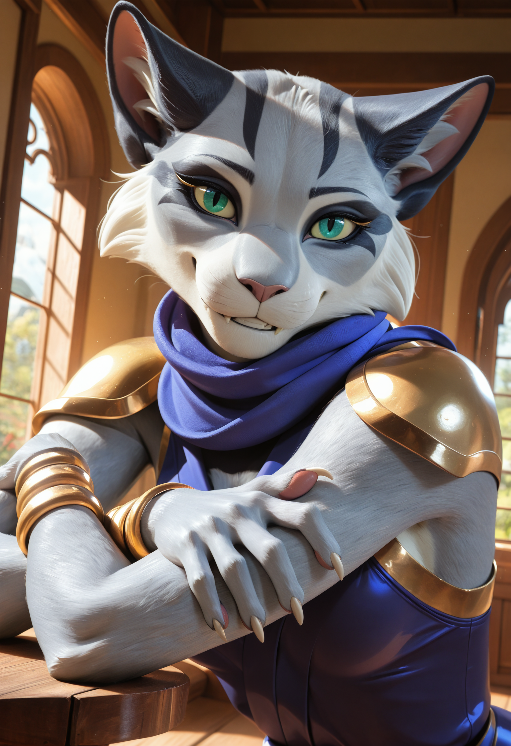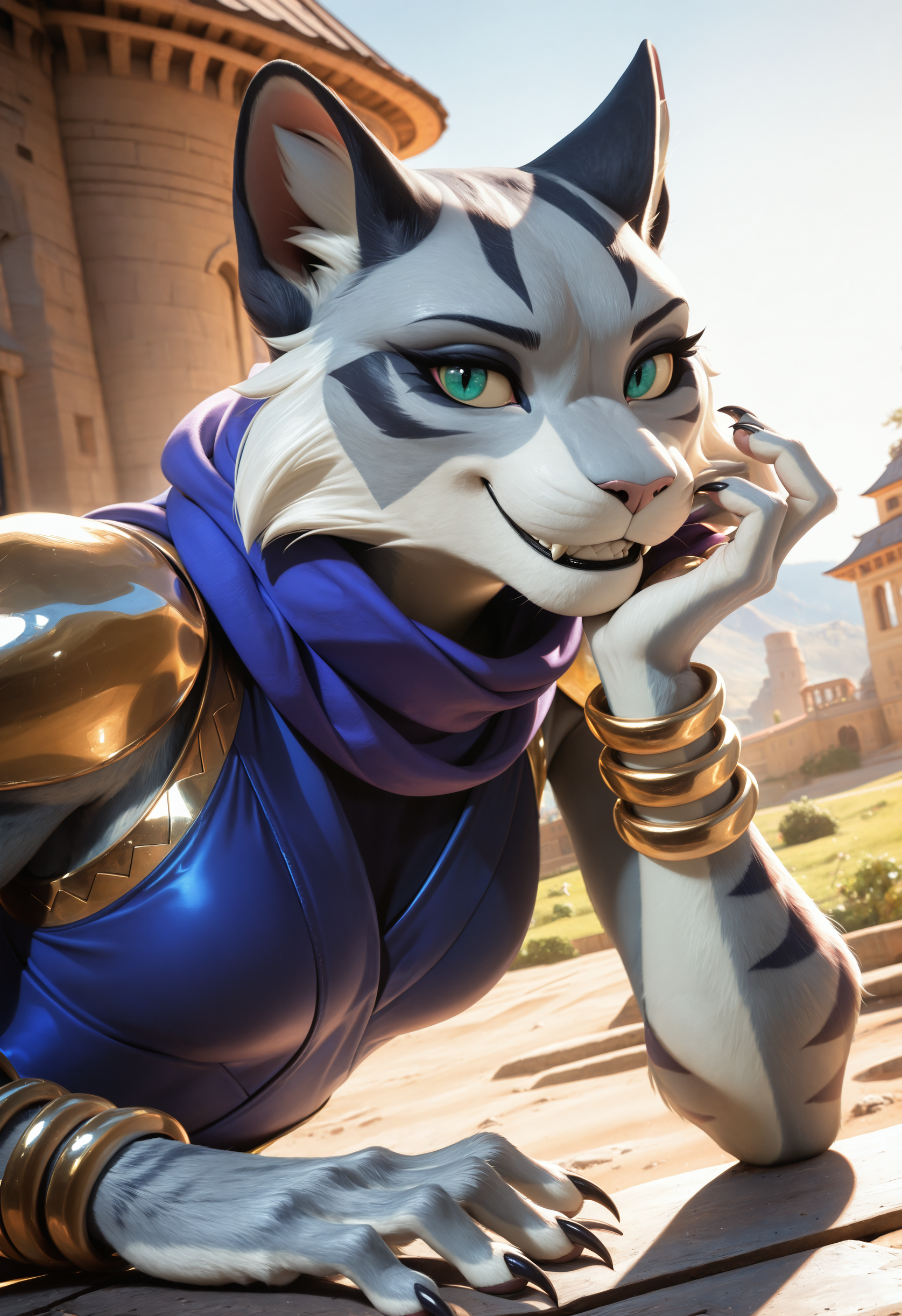 // Illustrious: asuri_brawlhalla, mammal, anthro, furry, felid, solo, 1girl, furry female, body fur, fur, clothing, hi res, looking at viewer, claws, armor, jewelry, bracelet, scarf