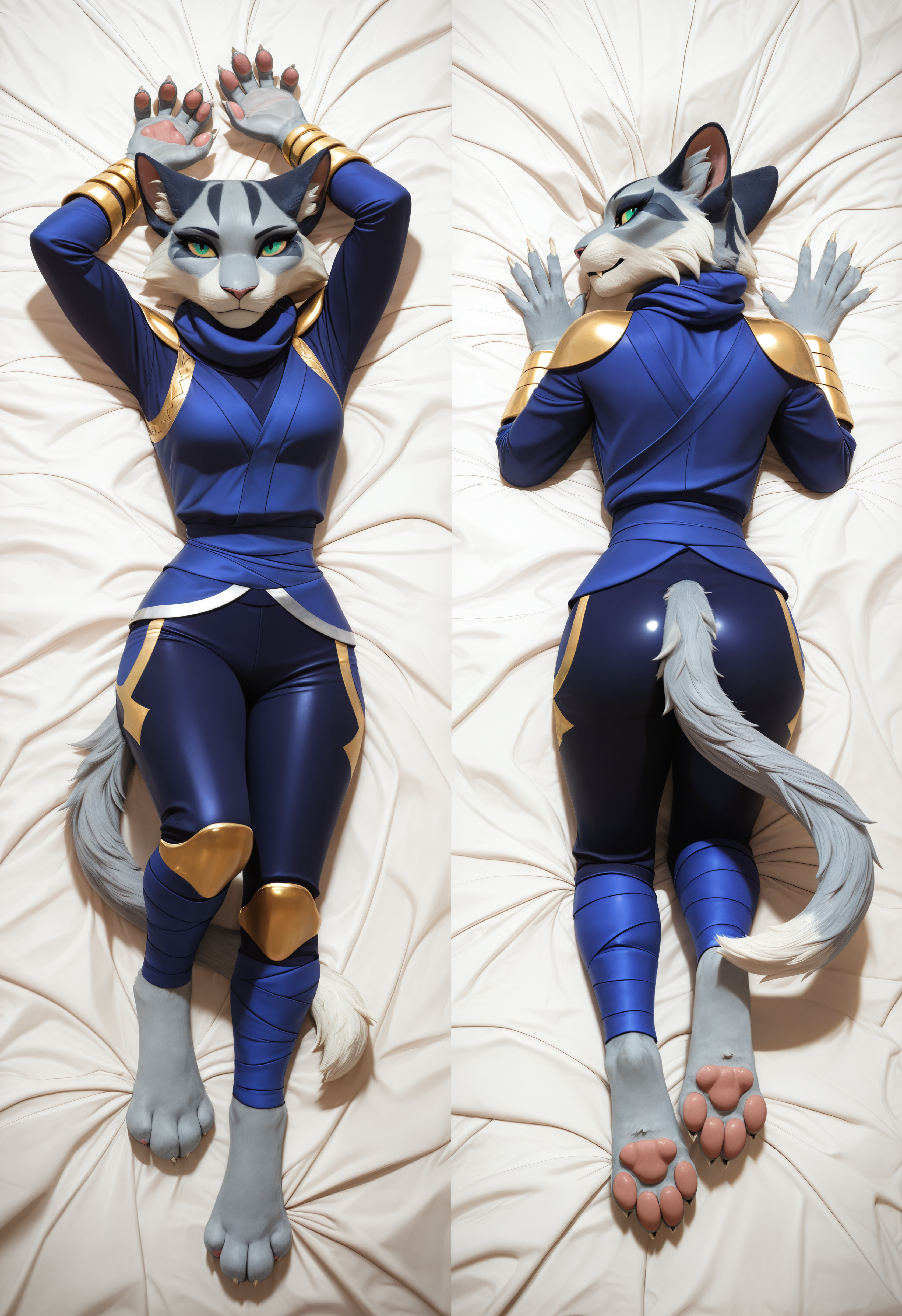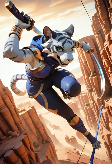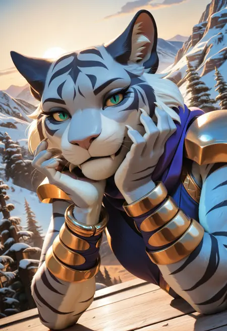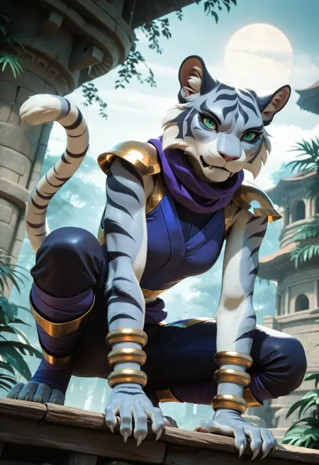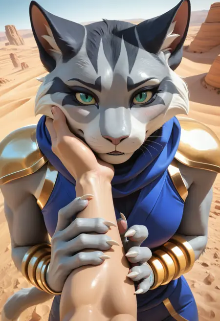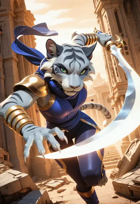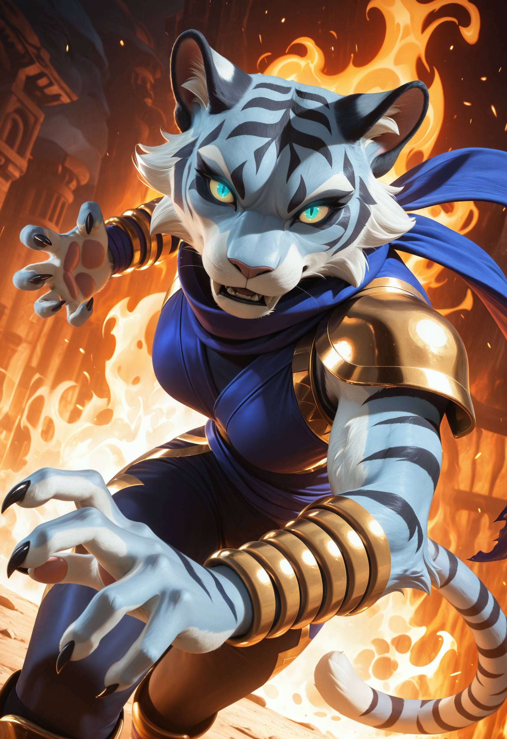 // Illustrious: asuri_brawlhalla, mammal, anthro, furry, felid, solo, 1girl, furry female, body fur, fur, clothing, hi res, looking at viewer, claws, armor, jewelry, bracelet, scarf